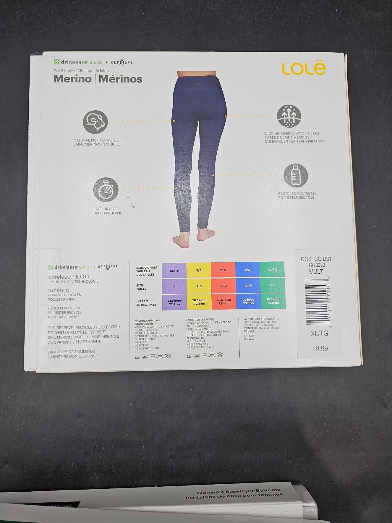 Lole dri release Wool blend Merino baselayer bottoms (XL) Navy