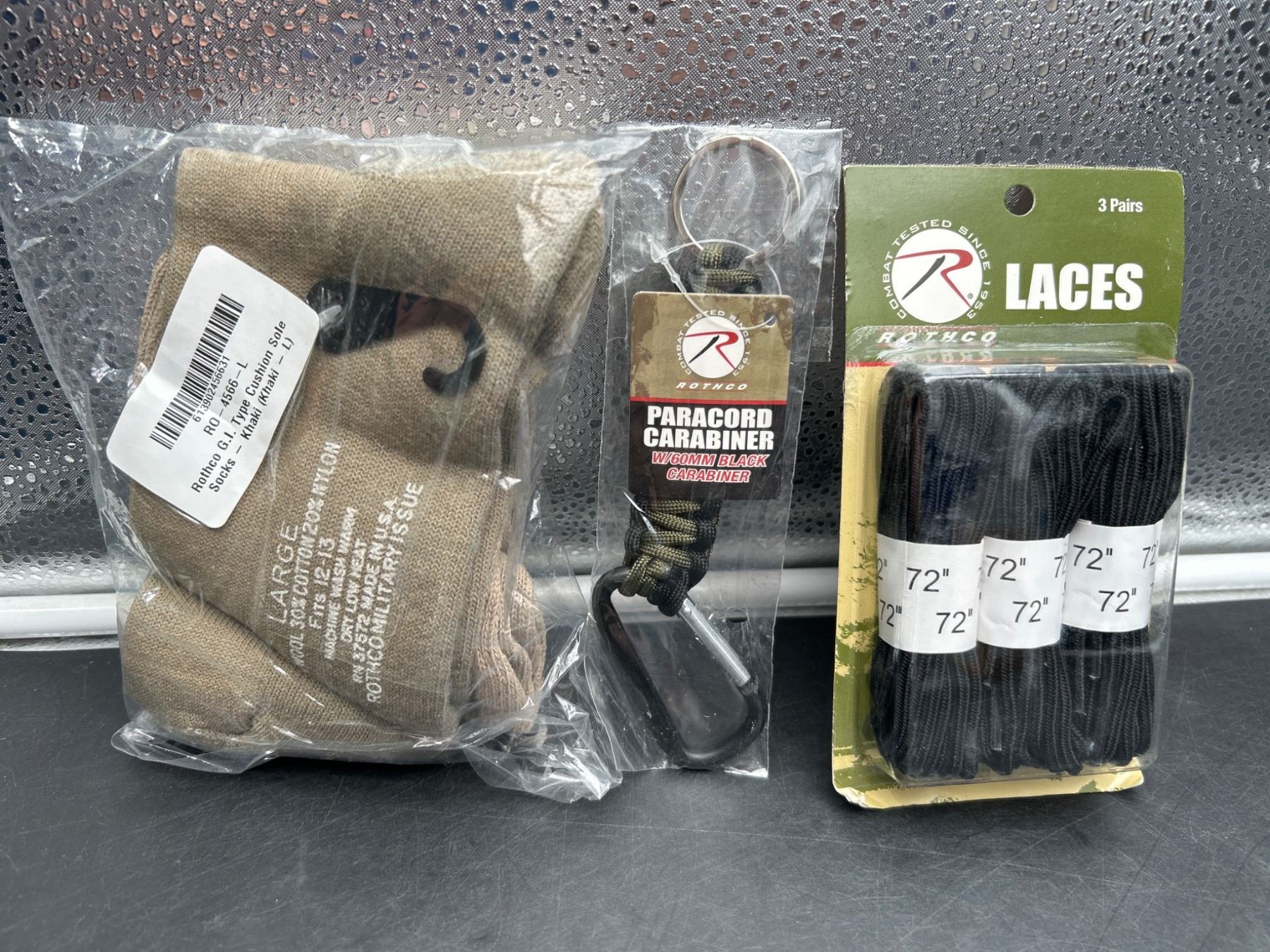 Lot of Rothco Paracord Carabiner, Laces, And G.I. Cushion Sole Socks, Large