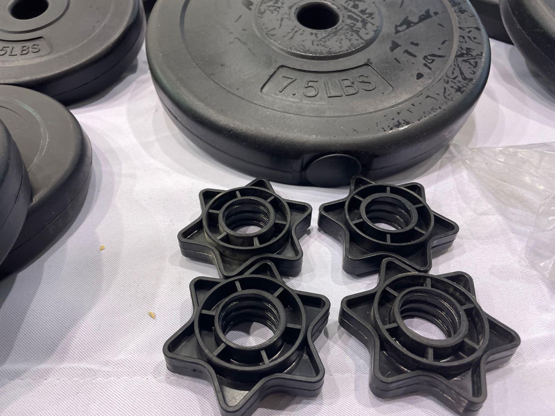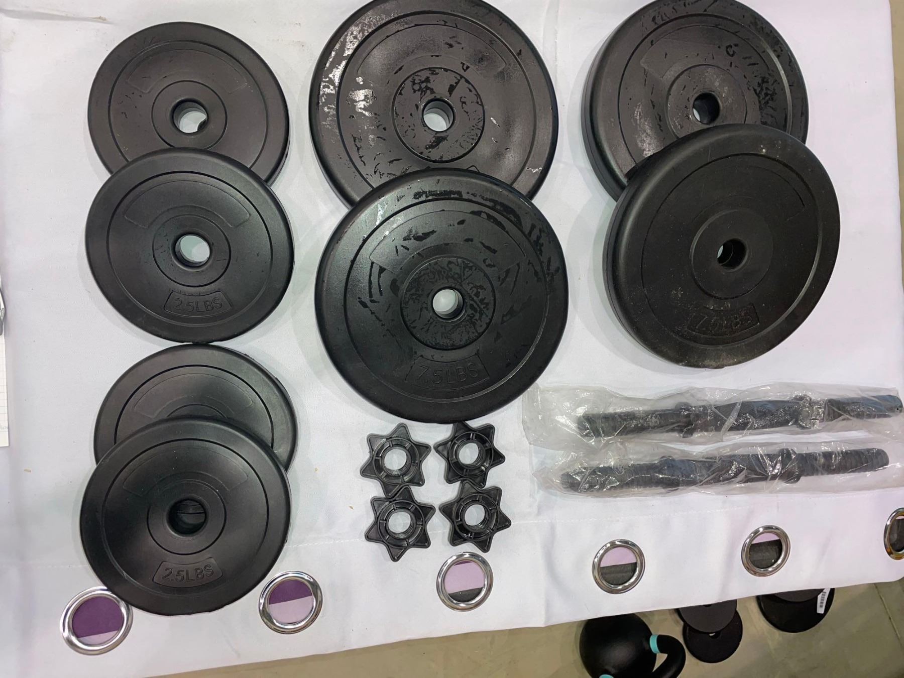 Lot of Weights 4 - 2.5lbs Plates 4 - 7.5lbs Plates and 2 Barbells