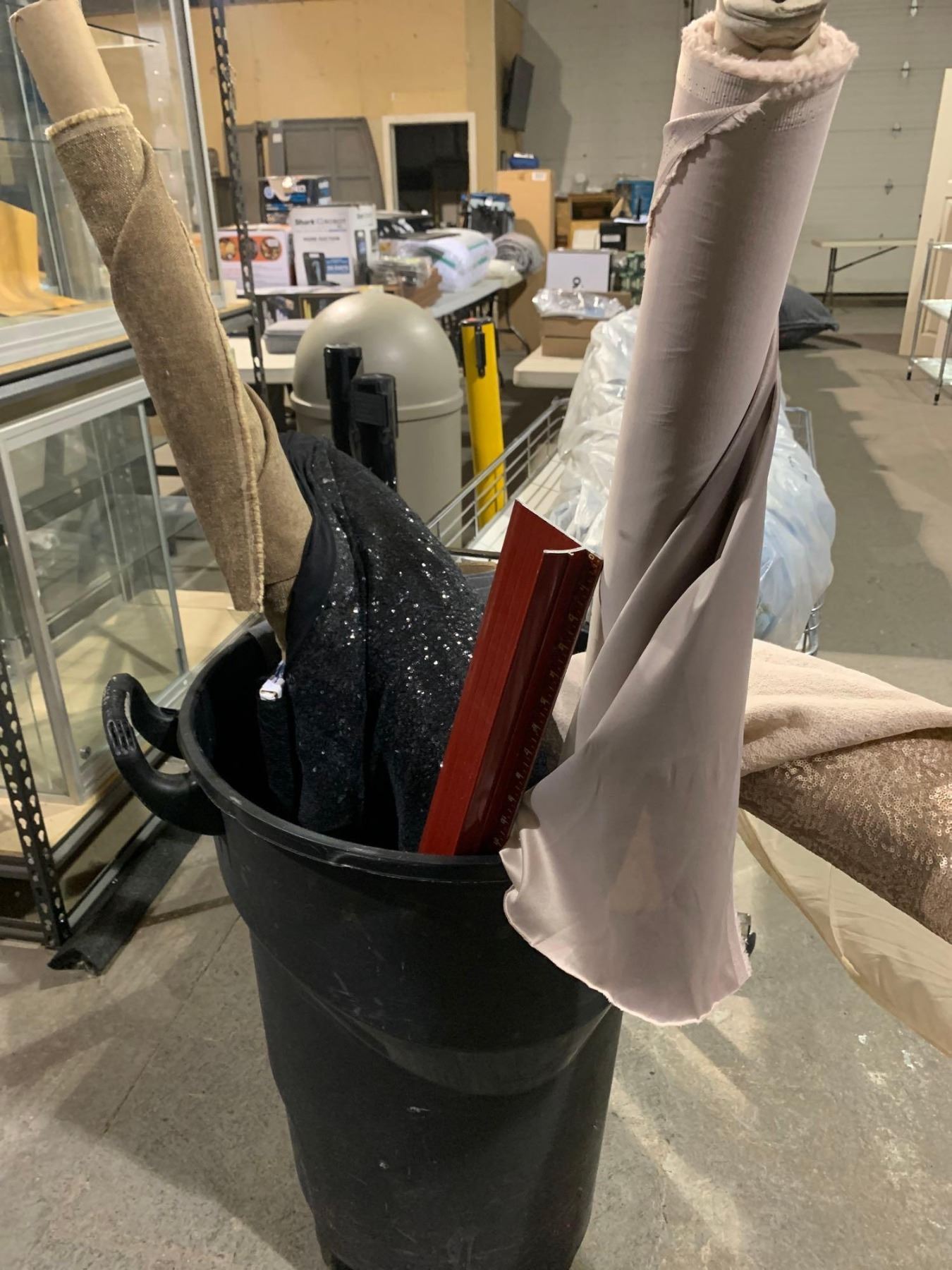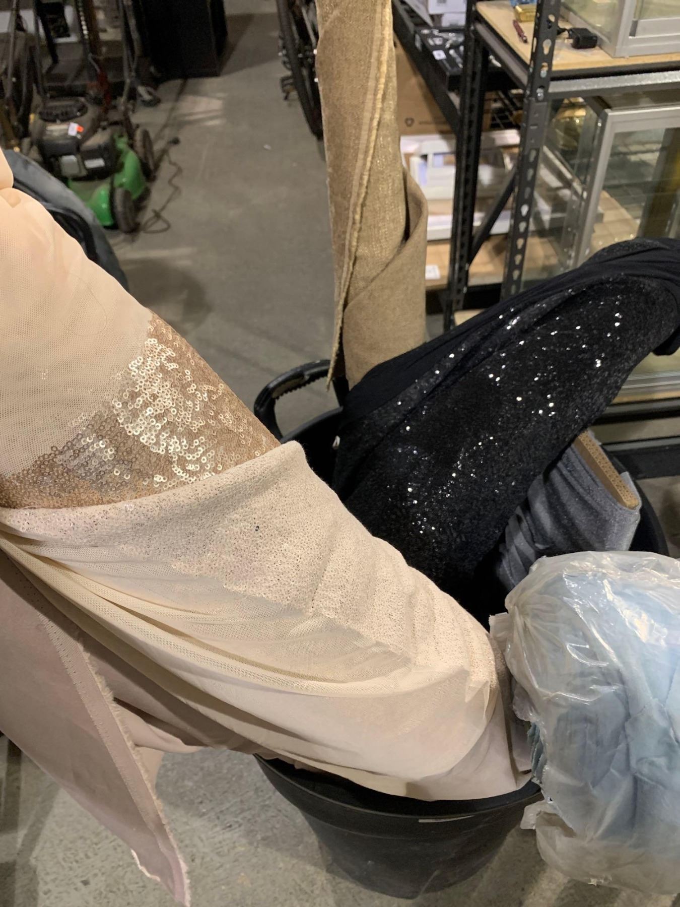 Lot of assorted bolts of fabric and rolling bin