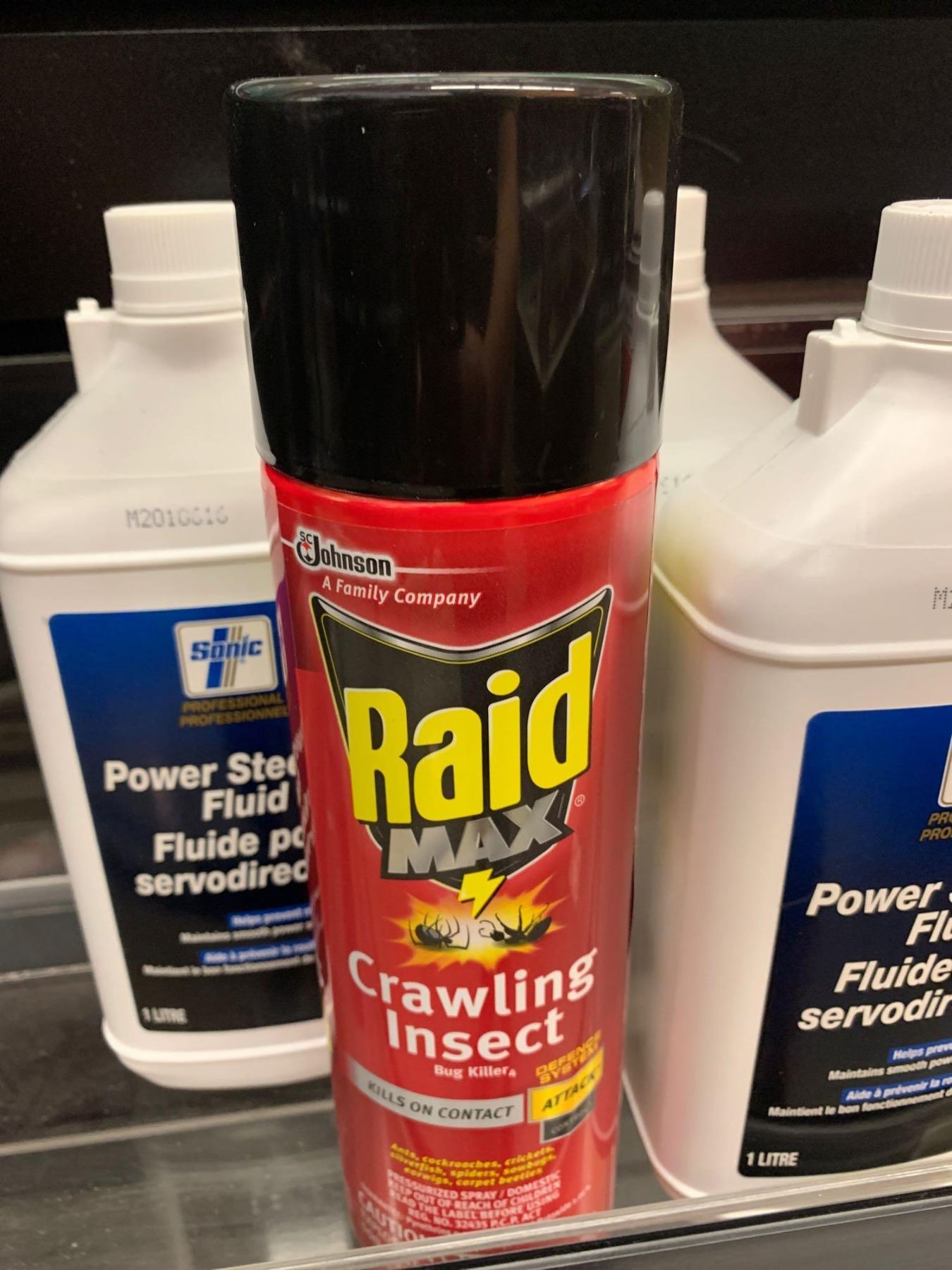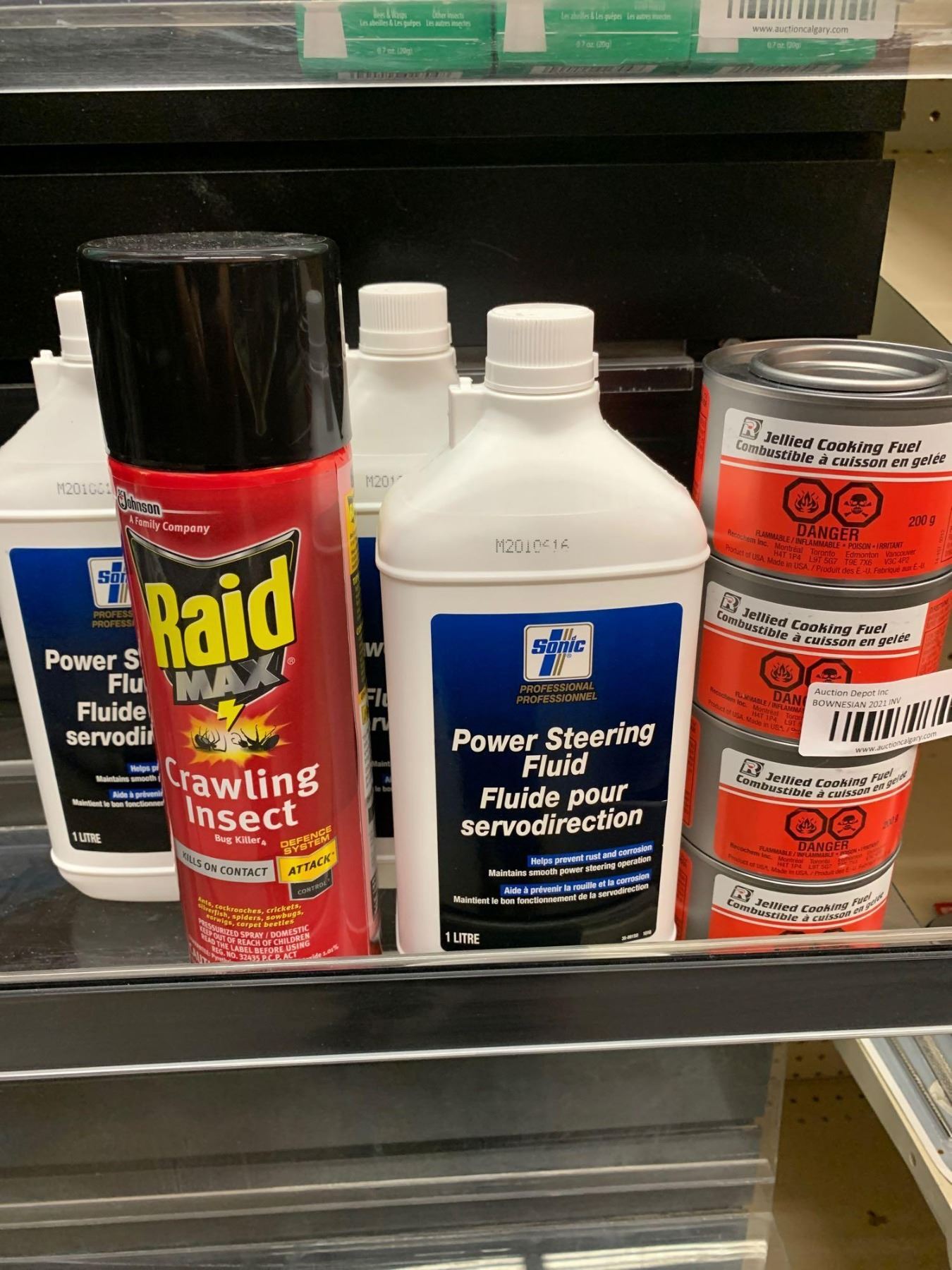 Lot of raid, power steering fluid and sterno - 8 items
