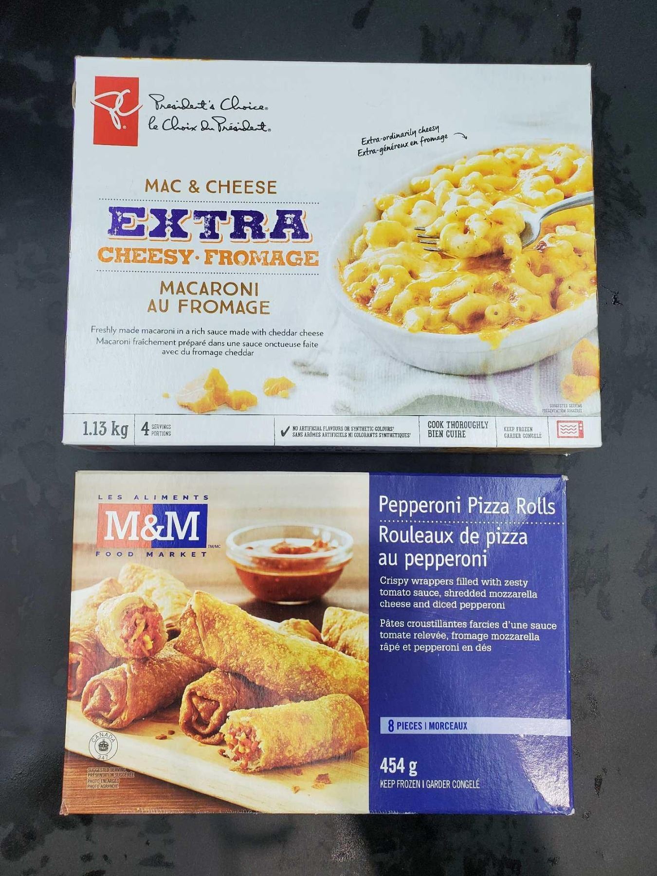 Mac & Cheese Extra Cheesy Macaroni (1.13kg), Pepperoni Pizza Rolls (454g)