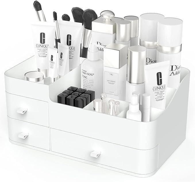 Makeup Organizer Storage with Drawers, Cosmetic Display Case for Brushes, Lotions, Perfumes, Eyeshadow, Nail Polish Ideal for Bathroom, Dresser, Countertop (White)