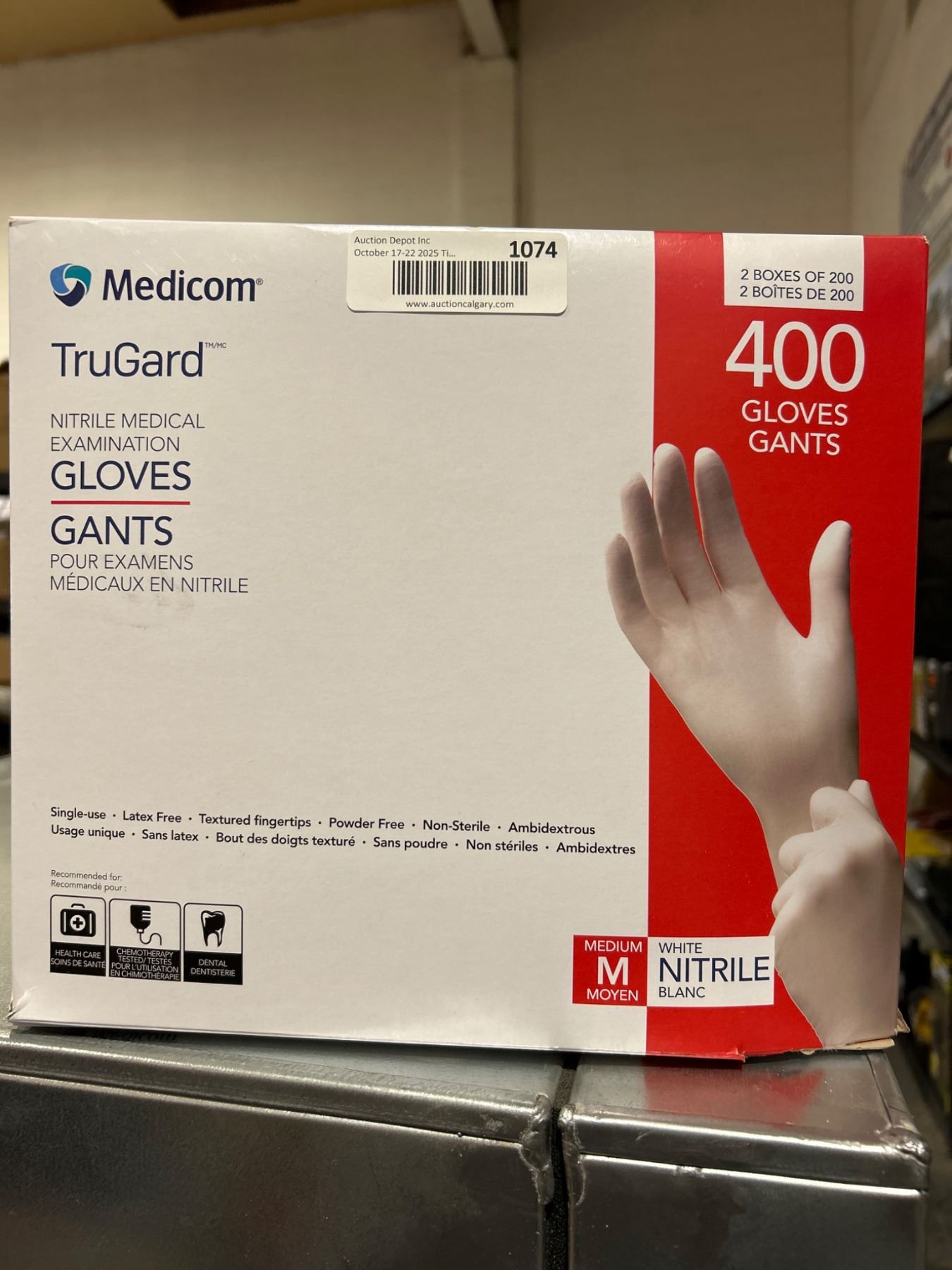 Medicom Truguard nitrile medical examination gloves, medium size, with a total of 400 gloves. Non-sterile and powder-free design made for single-use. Designed for durability and sensitivity. Measurements provided for correct palm sizing. Comes as shown in a 400-glove count configuration.