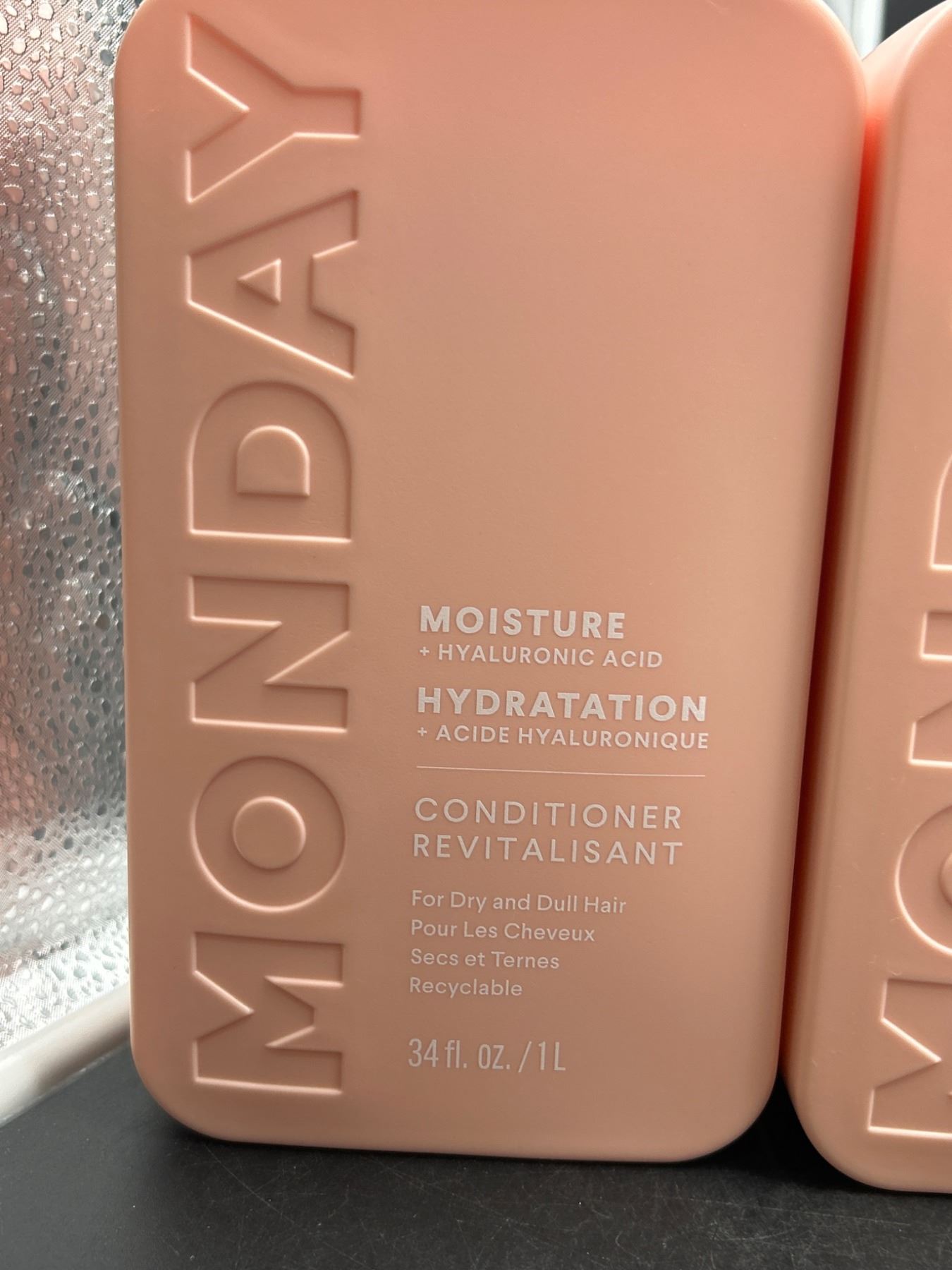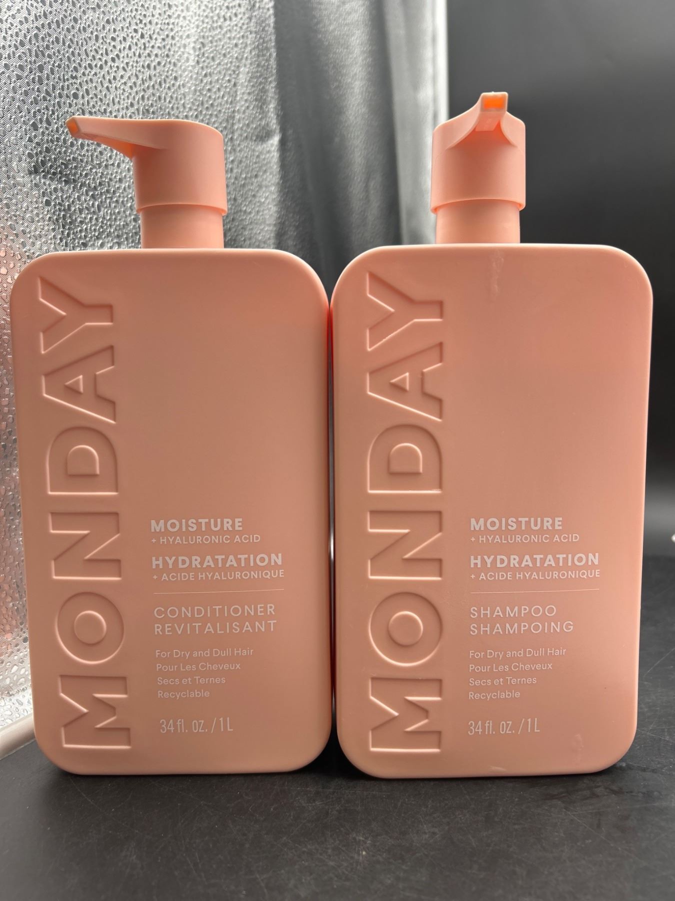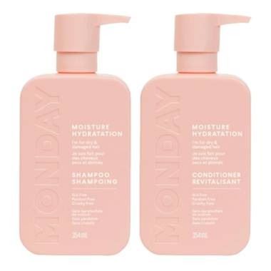 This set includes one 34 fl. oz. bottle of Monday Moisture Shampoo and one 34 fl. oz. bottle of Monday Moisture Conditioner. Both are formulated with hyaluronic acid for hydration and are suitable for dry and dull hair. The bottles are recyclable and clearly labeled in both English and French.