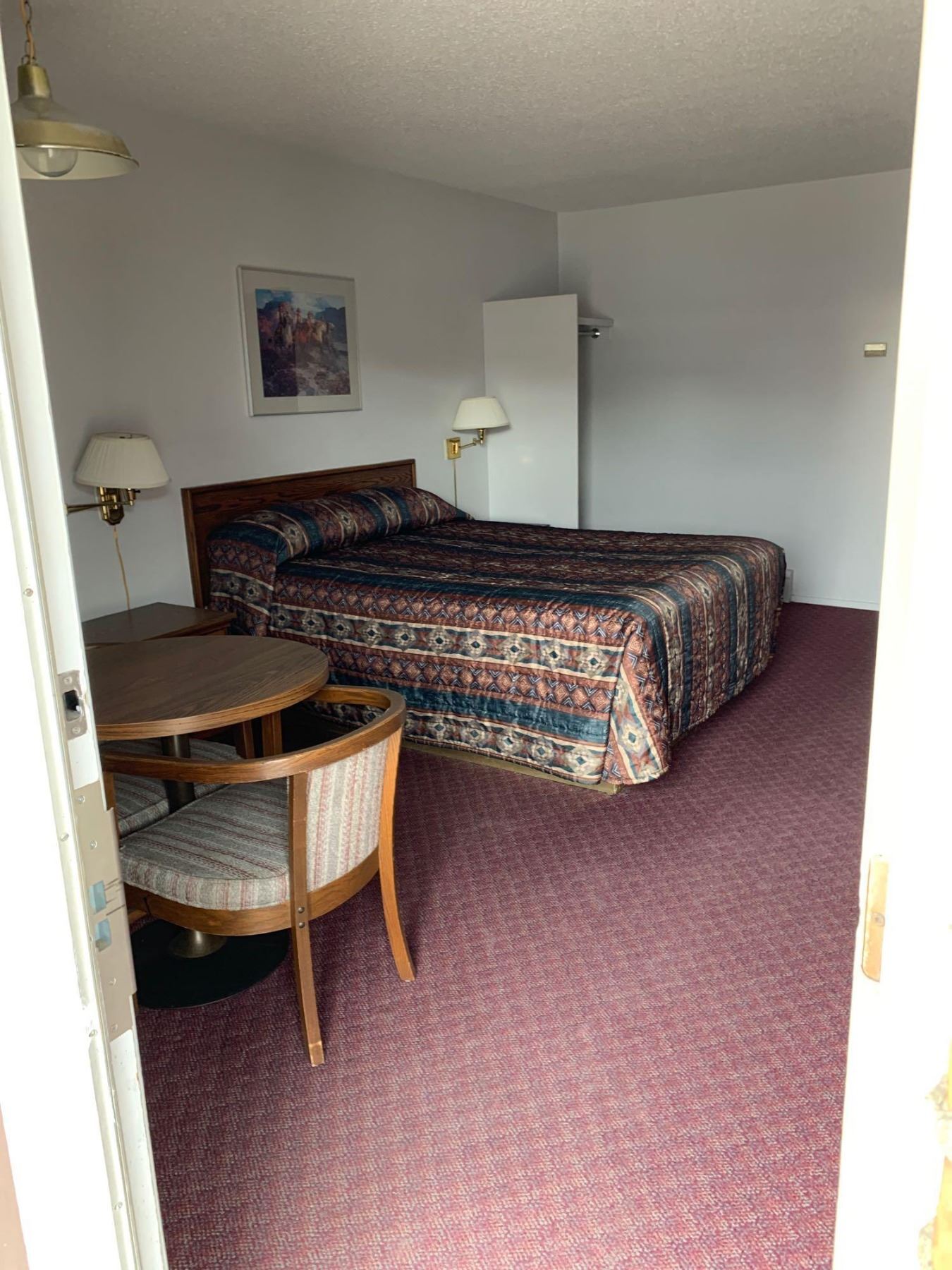 Motel Guest Room number: 18 includes as pictured: armoire dresser, desk with chair, luggage bench, Wall Mirror, Wall Lamp, Table Lamp, 32 inch flat panel TV with remote, curtains, night stands, western artwork, table & 2 chair set, curtains, towels, shower curtain, hanging lamp, Queen Bed with all linens,