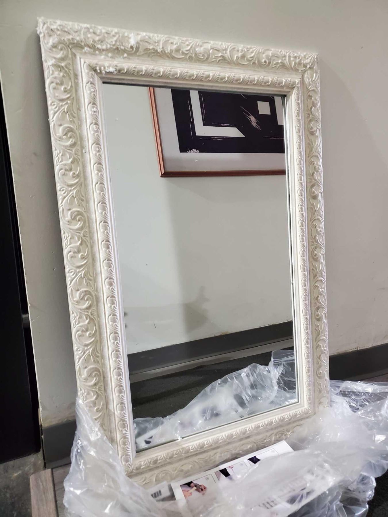 NEW Framed mirror white carved wood frame style approx 24 x 36 inch