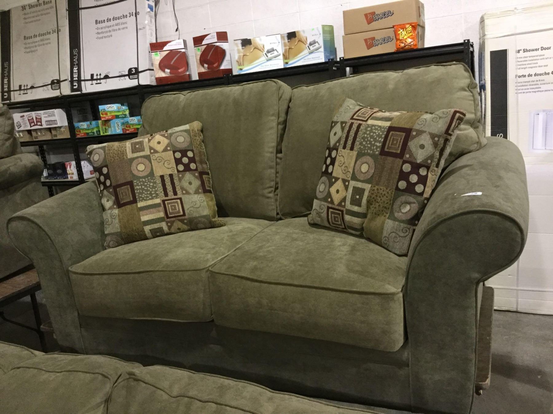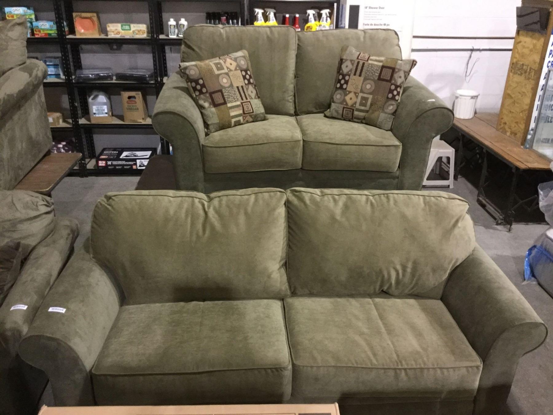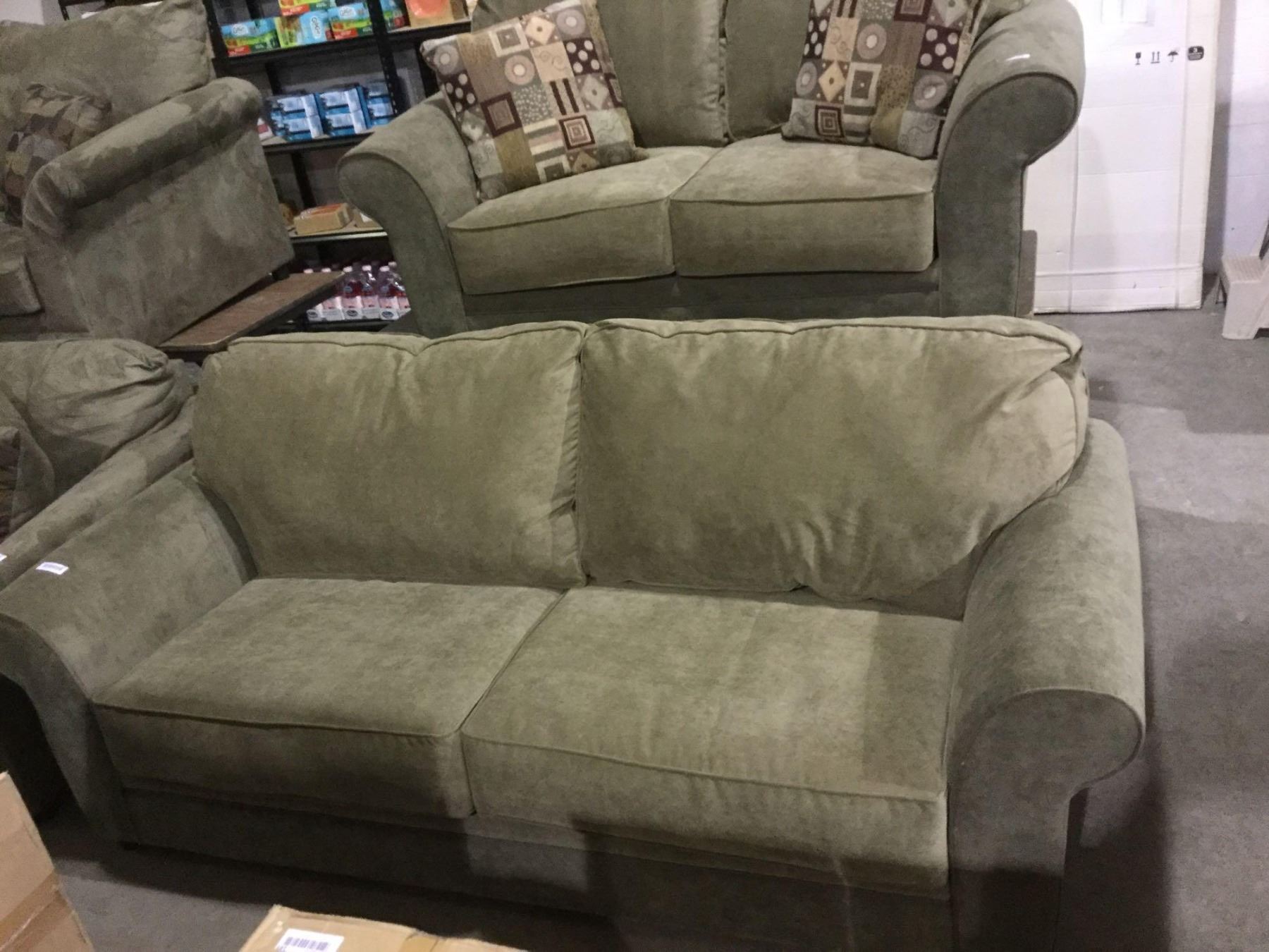 NEW Living room sofa suite includes Olive Green over stuffed pillow back design sofa with matching love seat