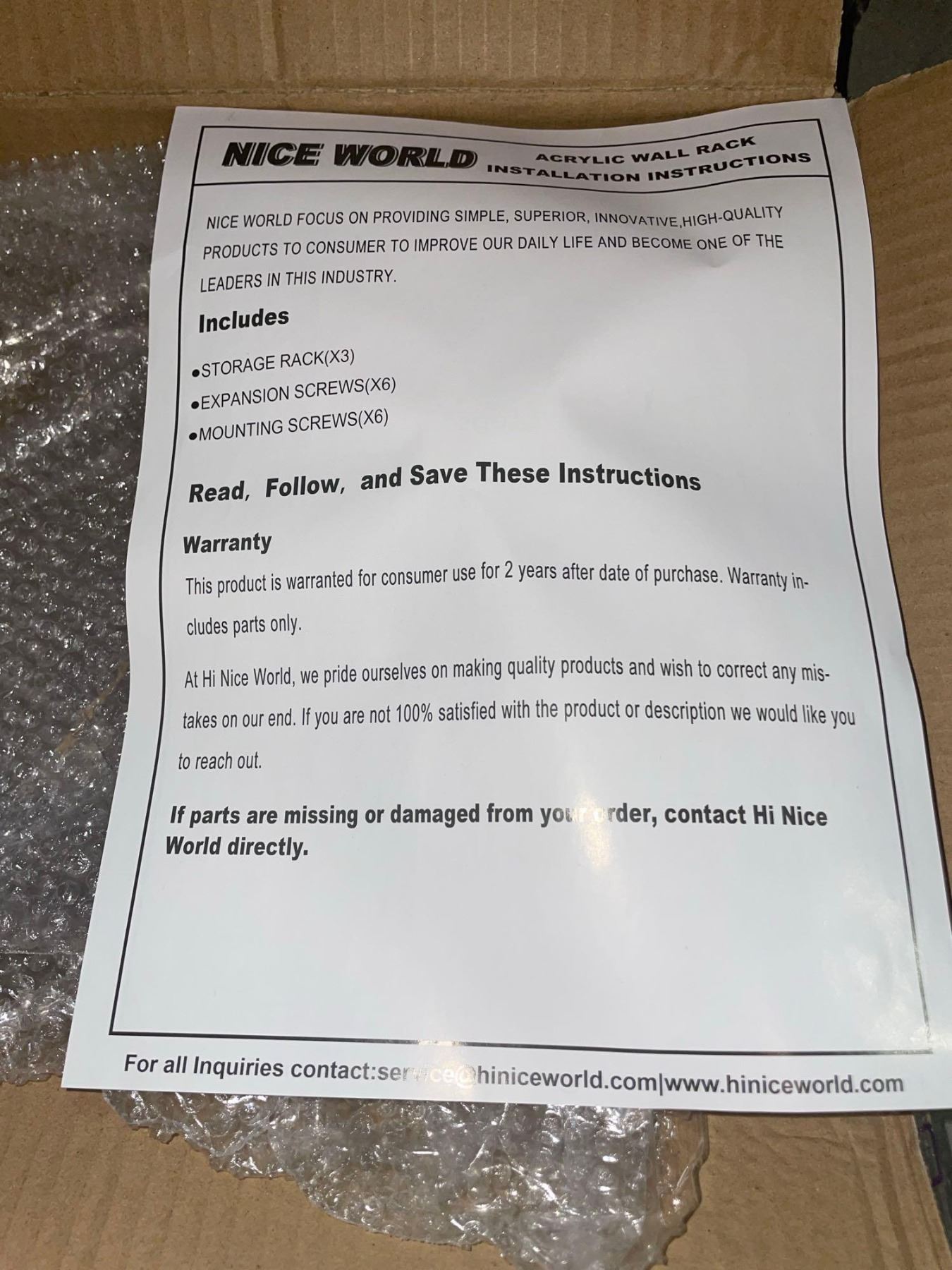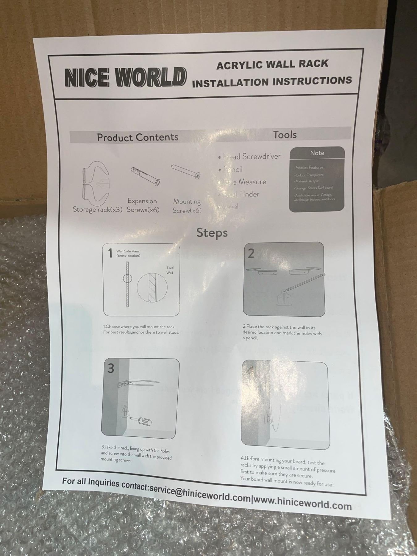 NEW Nice World Acrylic Wall Rack