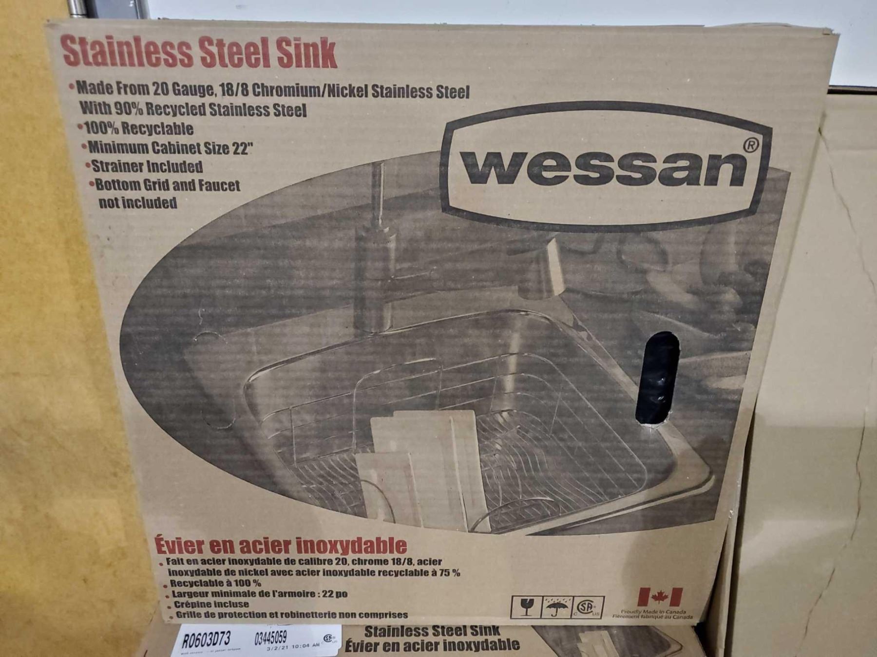 *NEW* Wessan Stainless Steel Single bowl drop-in sink. 20 ½” x 20” (52 cm x 51 cm). Centre-rear waste, 3 ½”