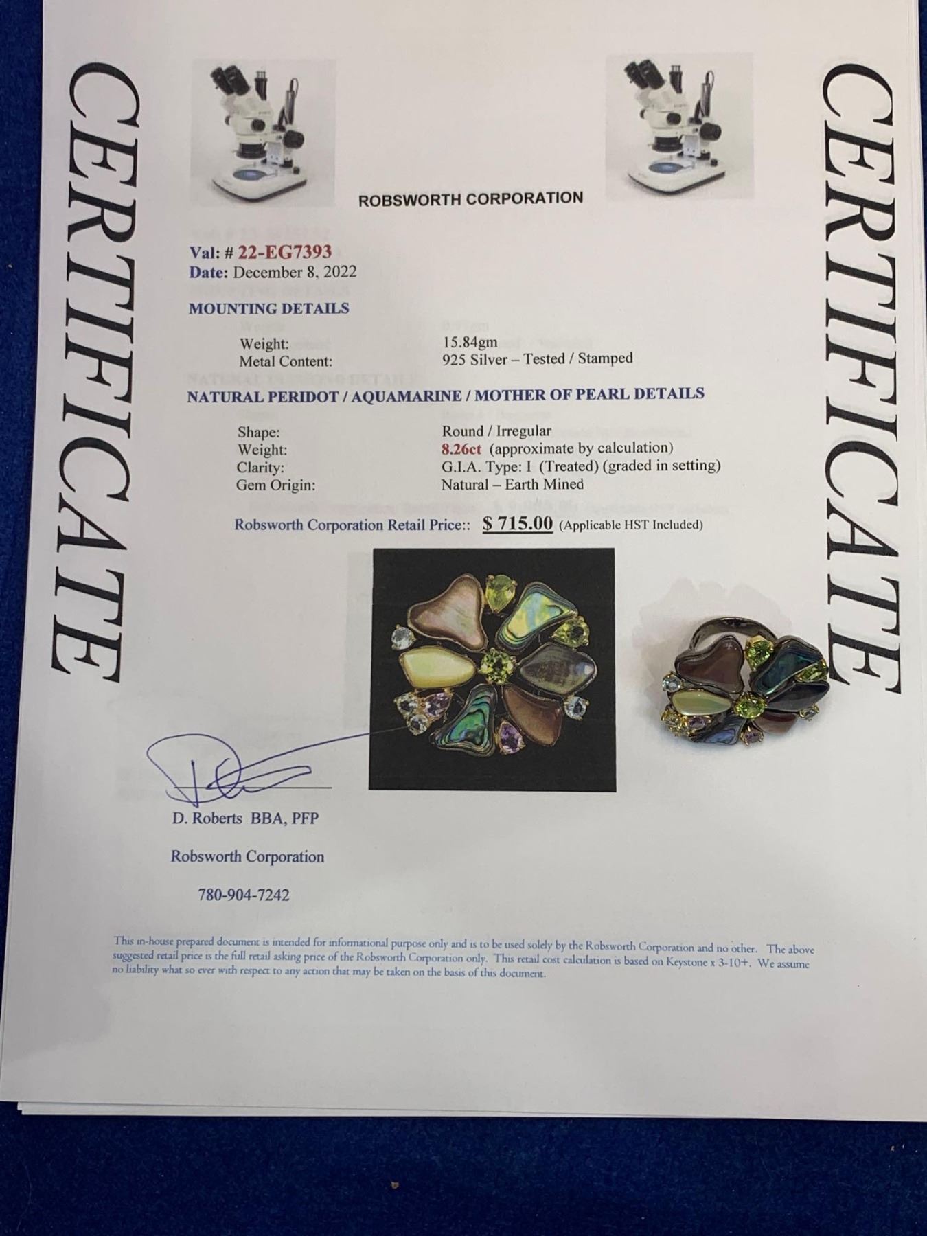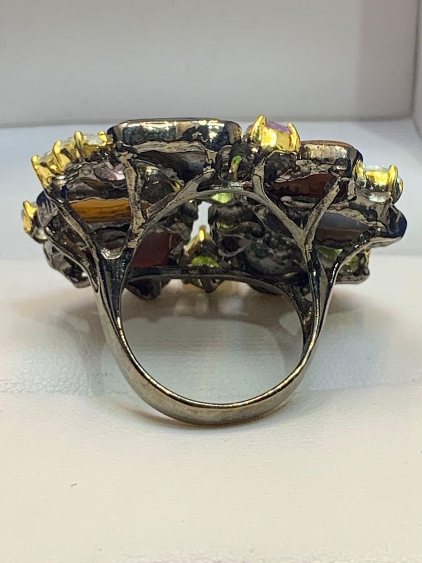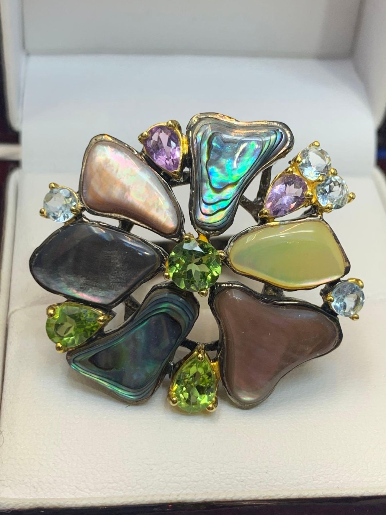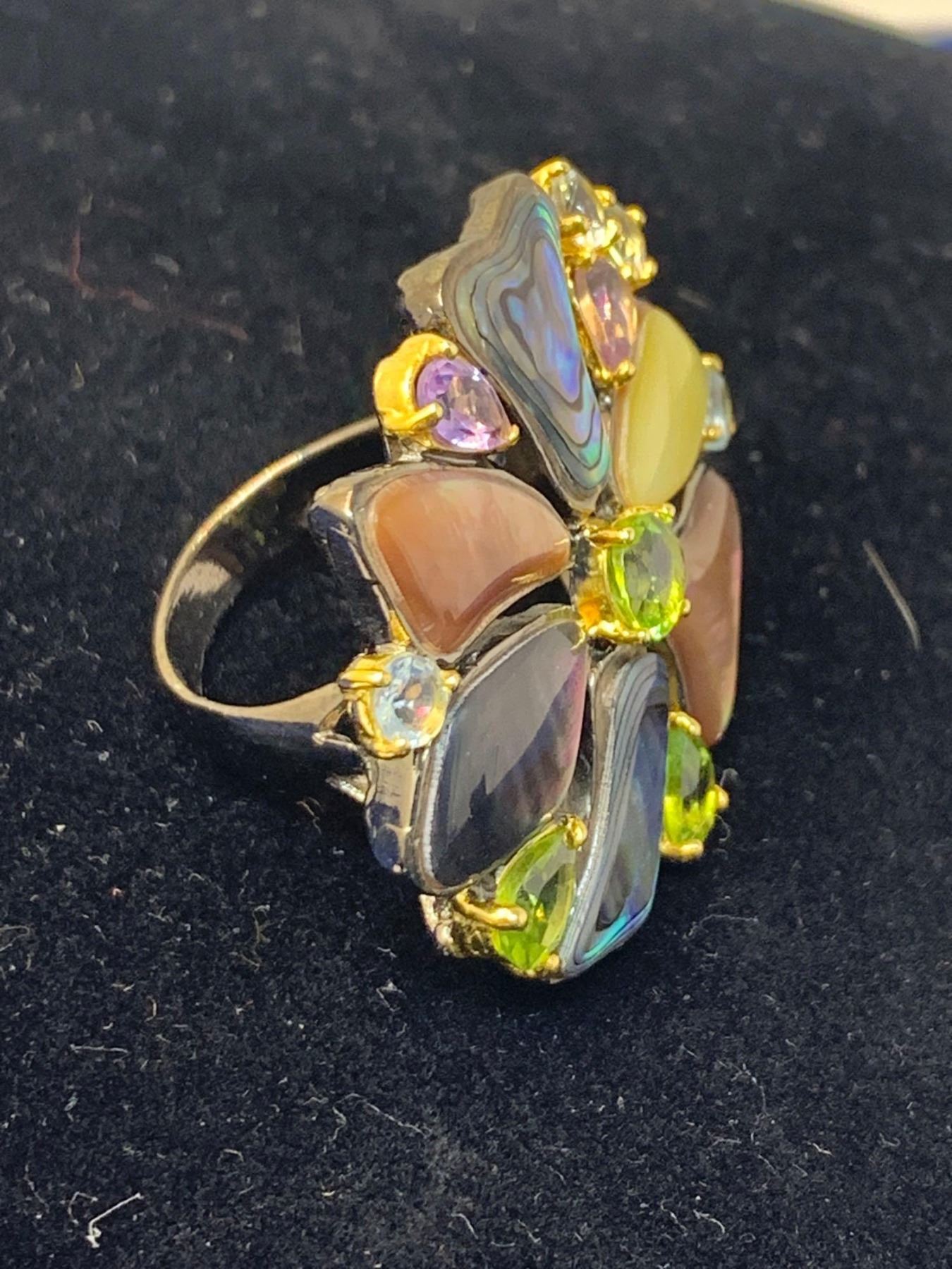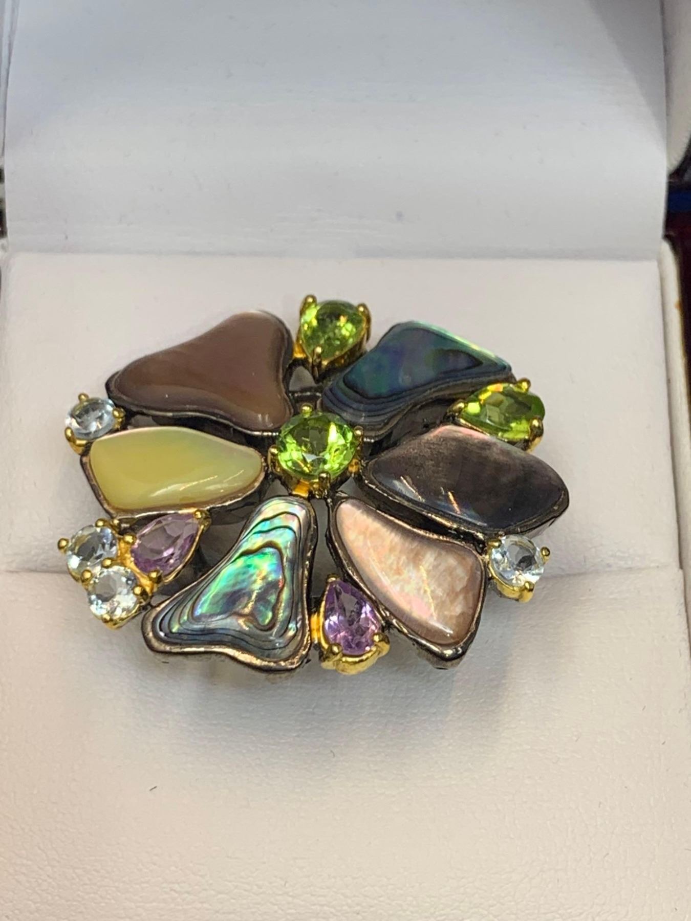 Natural Peridot, Aquamarine & Mother of Pearl Floral Cluster 8.26 Carat Stone Ring with Appraisal Certificate $715.00