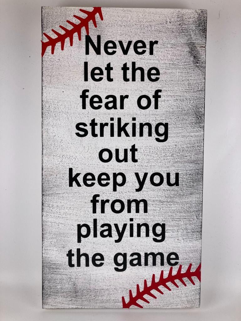Never let the fear of striking out keep you from playing the game 6X12 Inches. Made of Pine. Hooks on Back