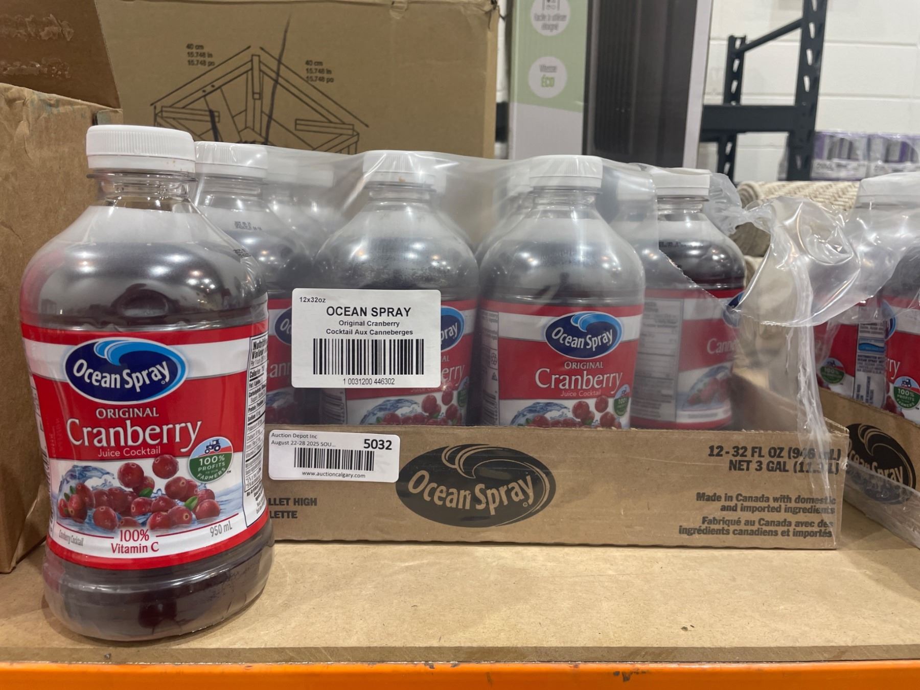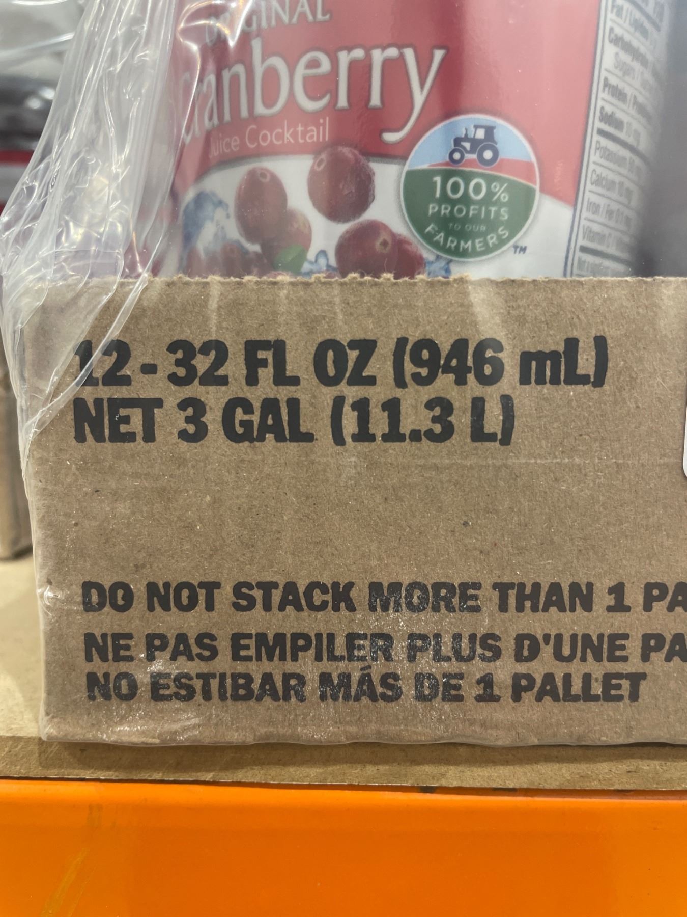 Ocean Spray Cranberry Juice Cocktail in a 12-bottle pack. Each bottle contains 32 fl oz (946 mL), with a total liquid quantity of 3 gallons (11.3 liters) for the pack. Made with 100% profits to farmers and featuring cranberry juice as the main ingredient. Distributed in a multi-language container with handling guidance printed on it.