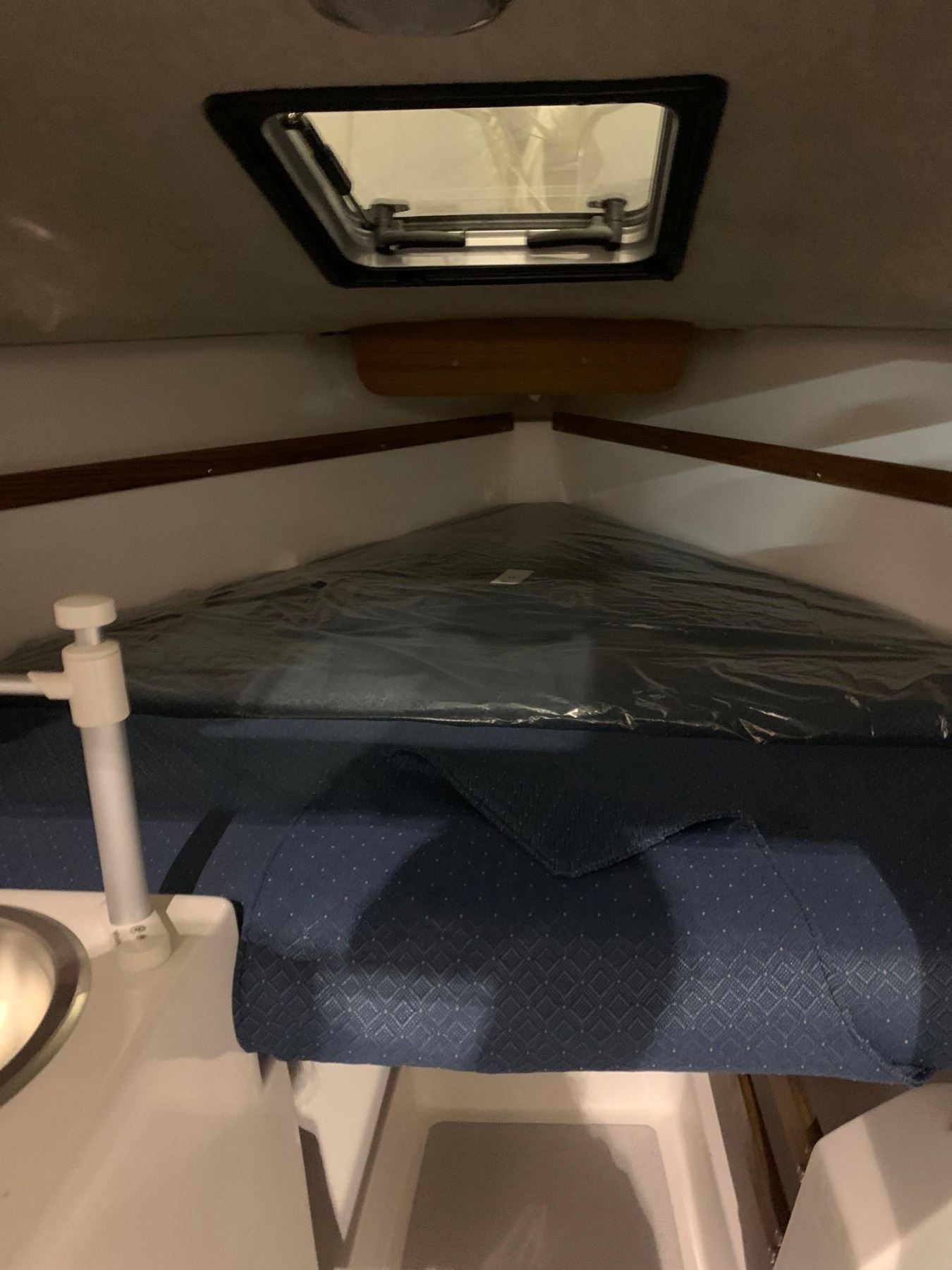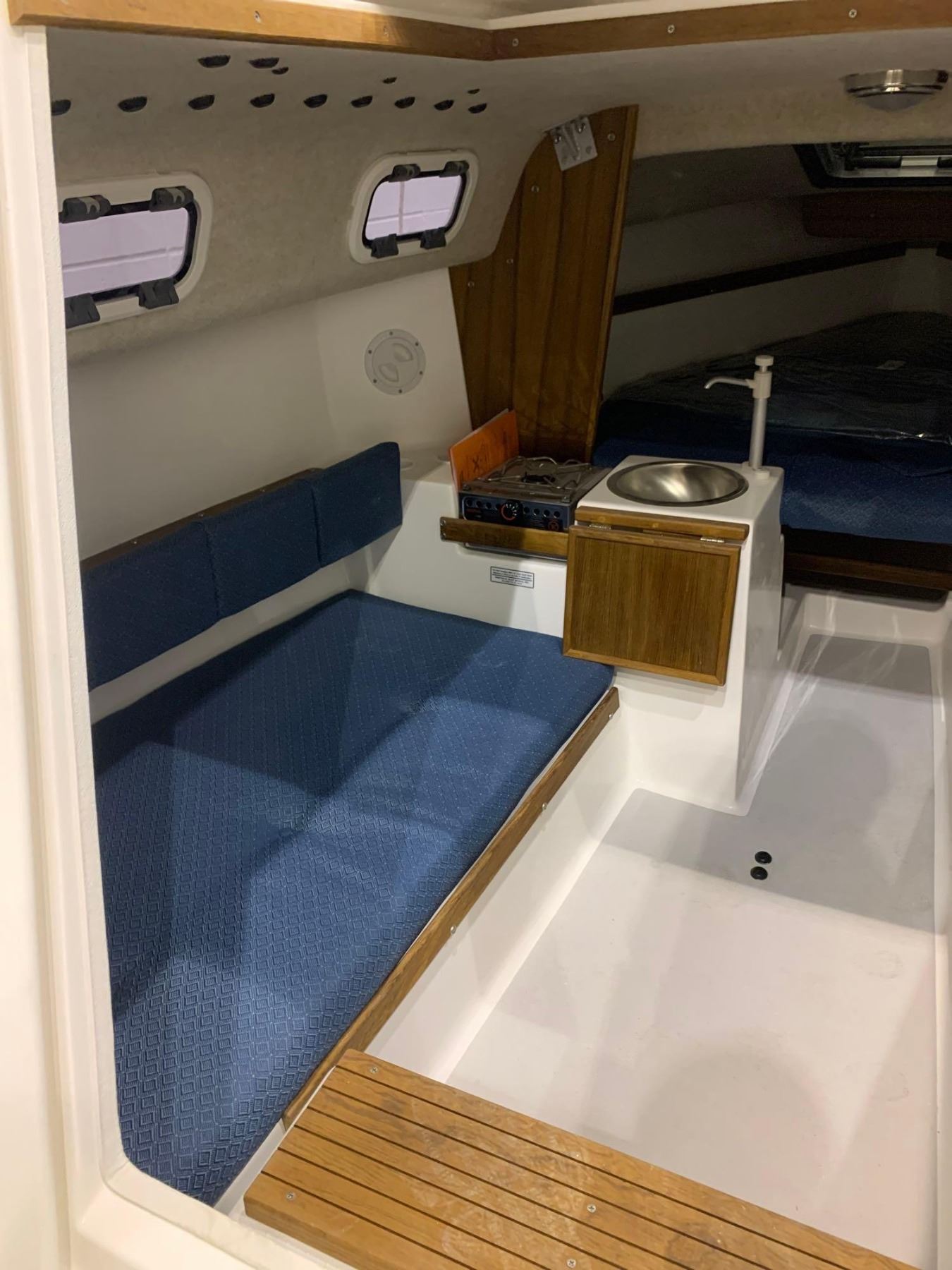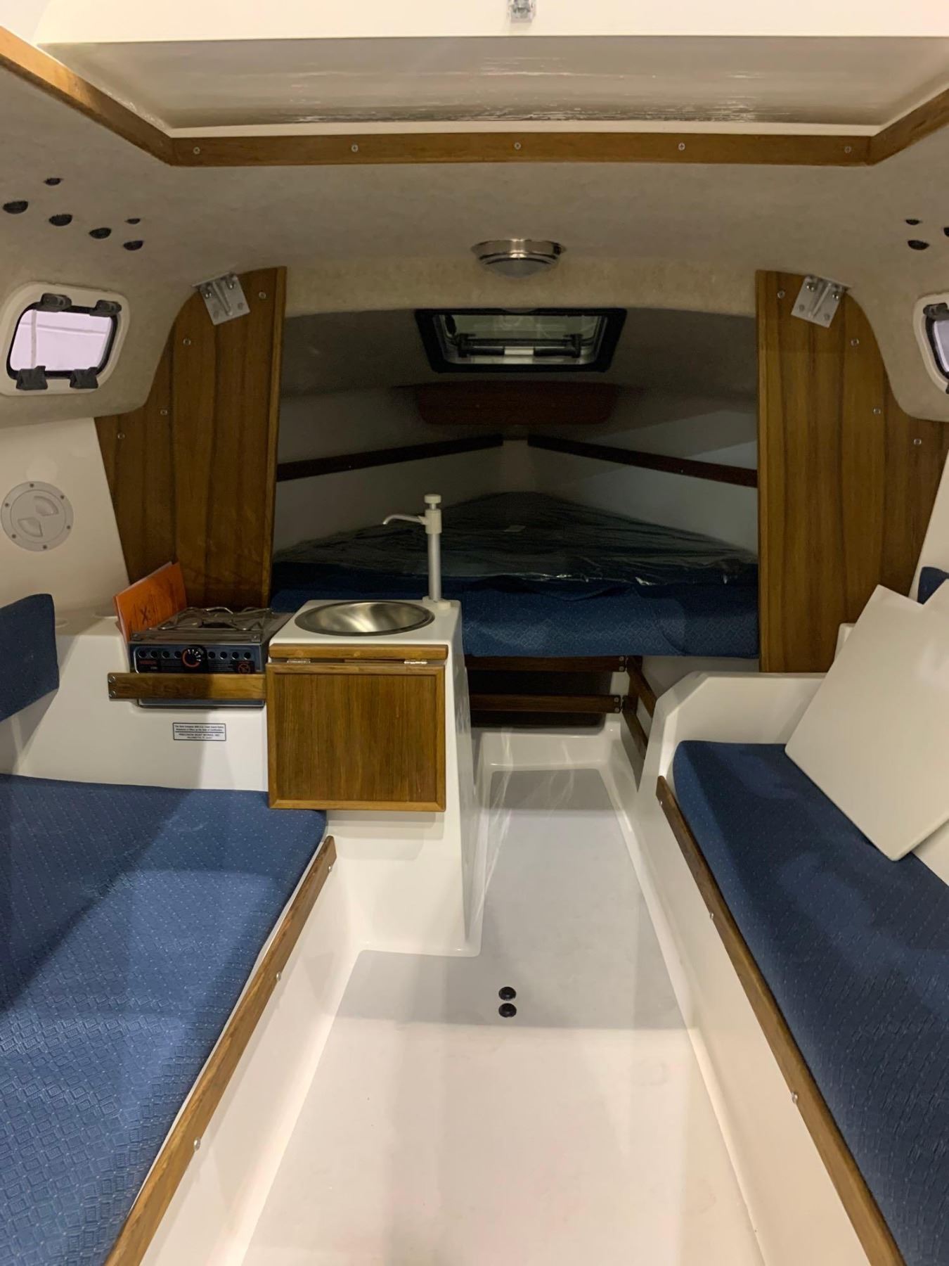 Standard Equipment Hull and Deck Iso/NPT gel coat finishHand laminated fiberglass constructionMolded in non-skid surfaceShoal draft keel with fiberglass centerboardInternal lead ballastOn deck anchor lockerMolded toe rails w/drainsOpening forward hatch4-6" mooring cleatsStainless steel bow pulpitStainless steel stern rail, stanchions & lifelinesBoarding ladderStainless steel bow eyeTeak trimAccent waterline & sheer stripesTeak handrails2 fixed and 2 opening ports Cockpit 7'1" self bailing cockpitVentilated fuel tank lockerSail lockerLaminated ash and mahogany tillerStainless steel adjustable motor mountWelded aluminum rudder headFiberglass kick-up rudder Cabin Molded 'structural grid' hull linerDeluxe fabric covered cushionsBerths for 4 adultsBackrest cushions w/shelvesShelves over v-berthsMolded storage lockers under berthsHead area located forward of bulkhead Electrical 12 volt electrical systemFused switch panelInterior lightsNavigation lightsSteaming lightBattery box Spars and Rigging Anodized mast & boom4:1 'Harken' mainsheet systemGenoa winches & handle"Harken" ball bearing blocksGenoa track with carsPrestretched Dacron halyardsSpliced halyard shacklesPrestretched Dacron sheets & running riggingSplit backstayChromed bronze open body turnbuckles w/togglesTopping liftHinged mast stepSwaged stainless steel standing rigging Galley Alcohol stoveStainless steel sinkManual water pumpStorage binsSelf contained water system48 qt. Igloo ice chest with teak step Sails Dacron main and jibJiffy reefing system with 1 reef point