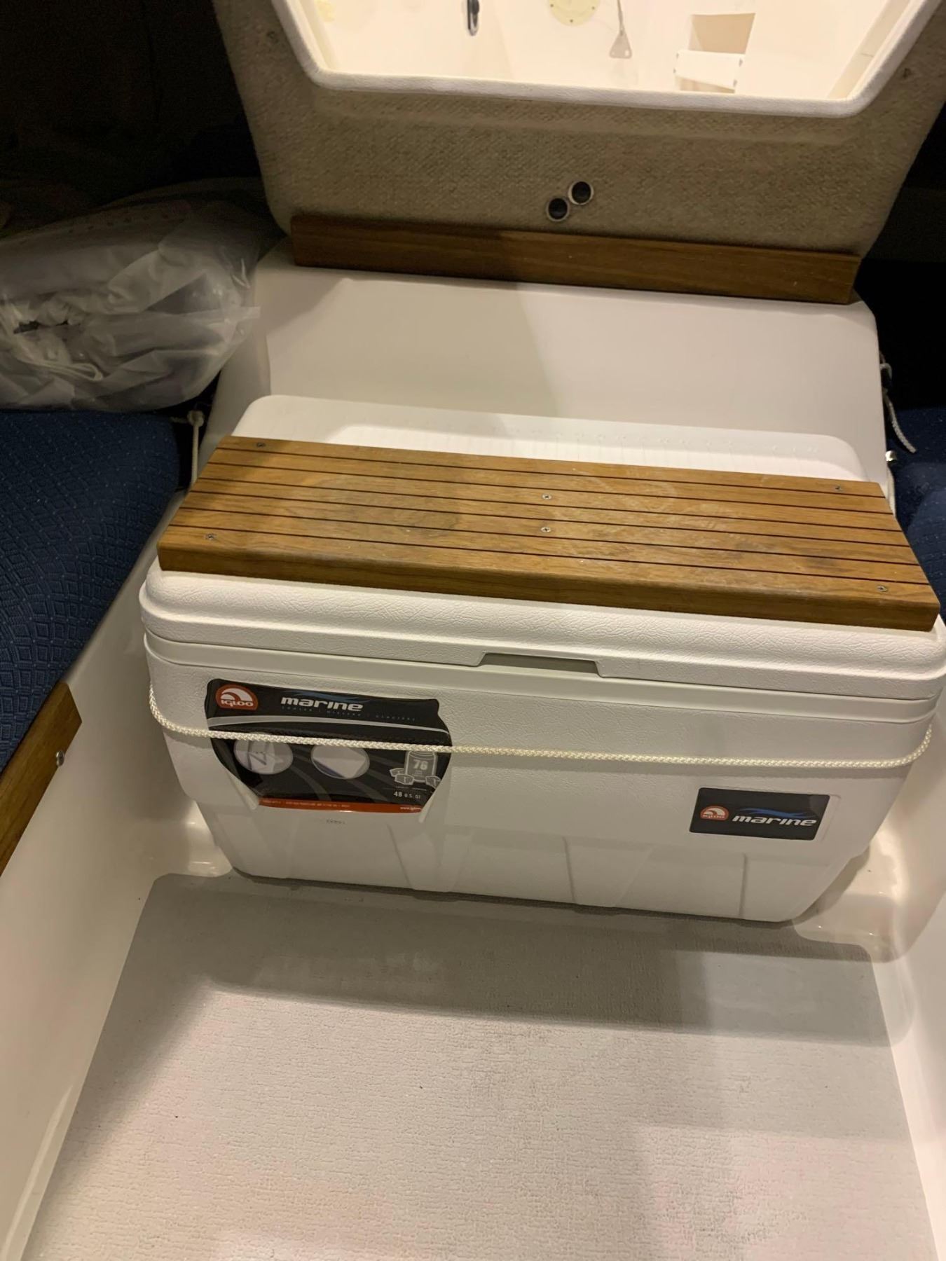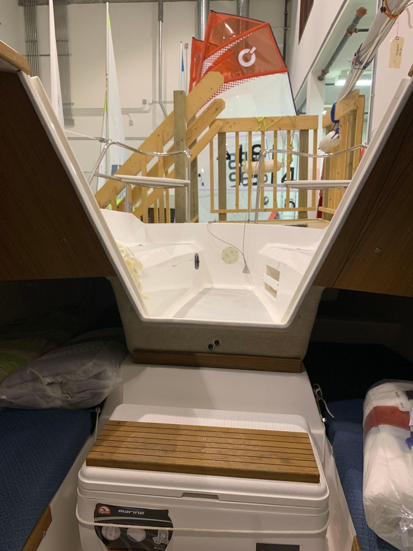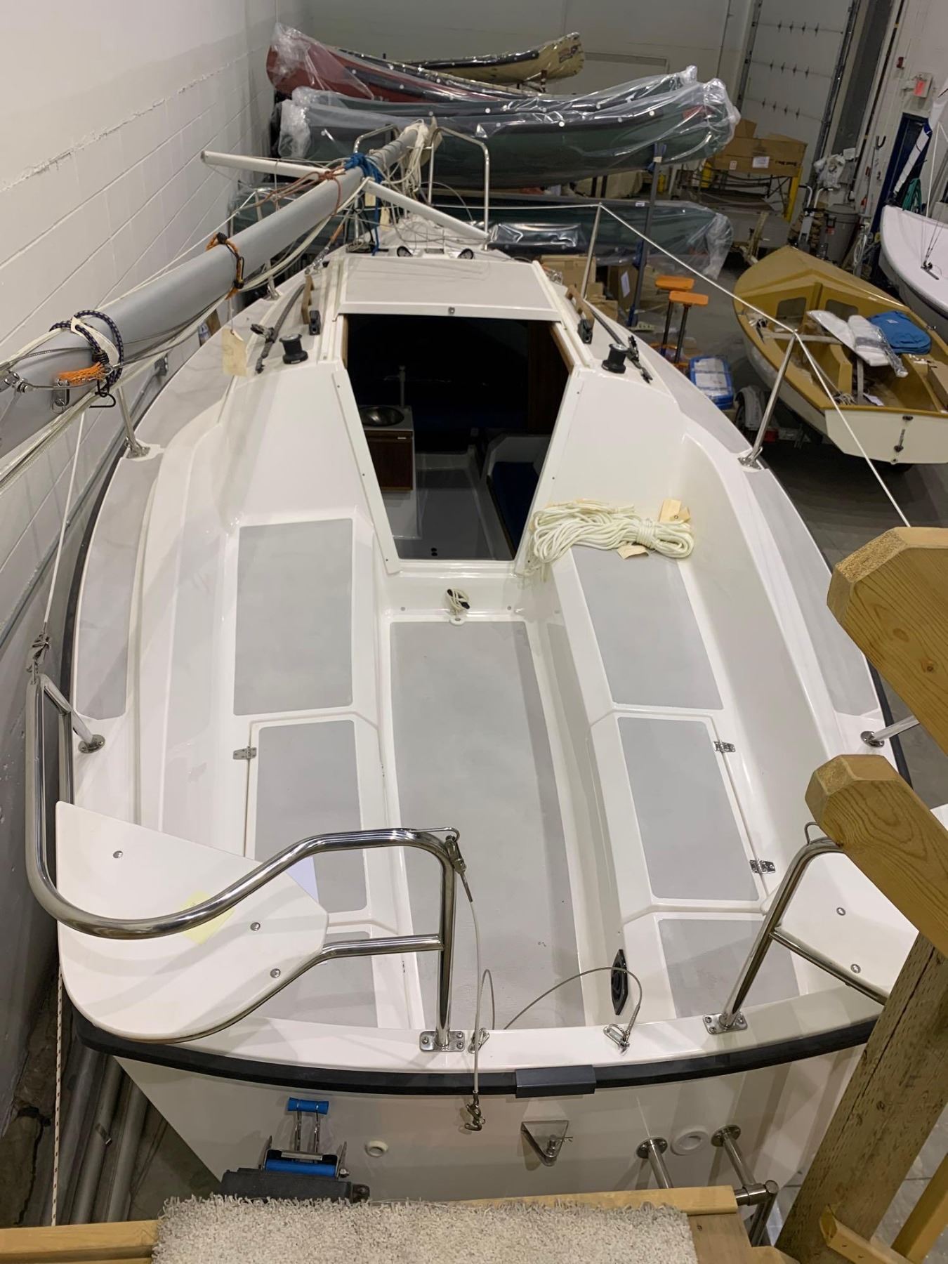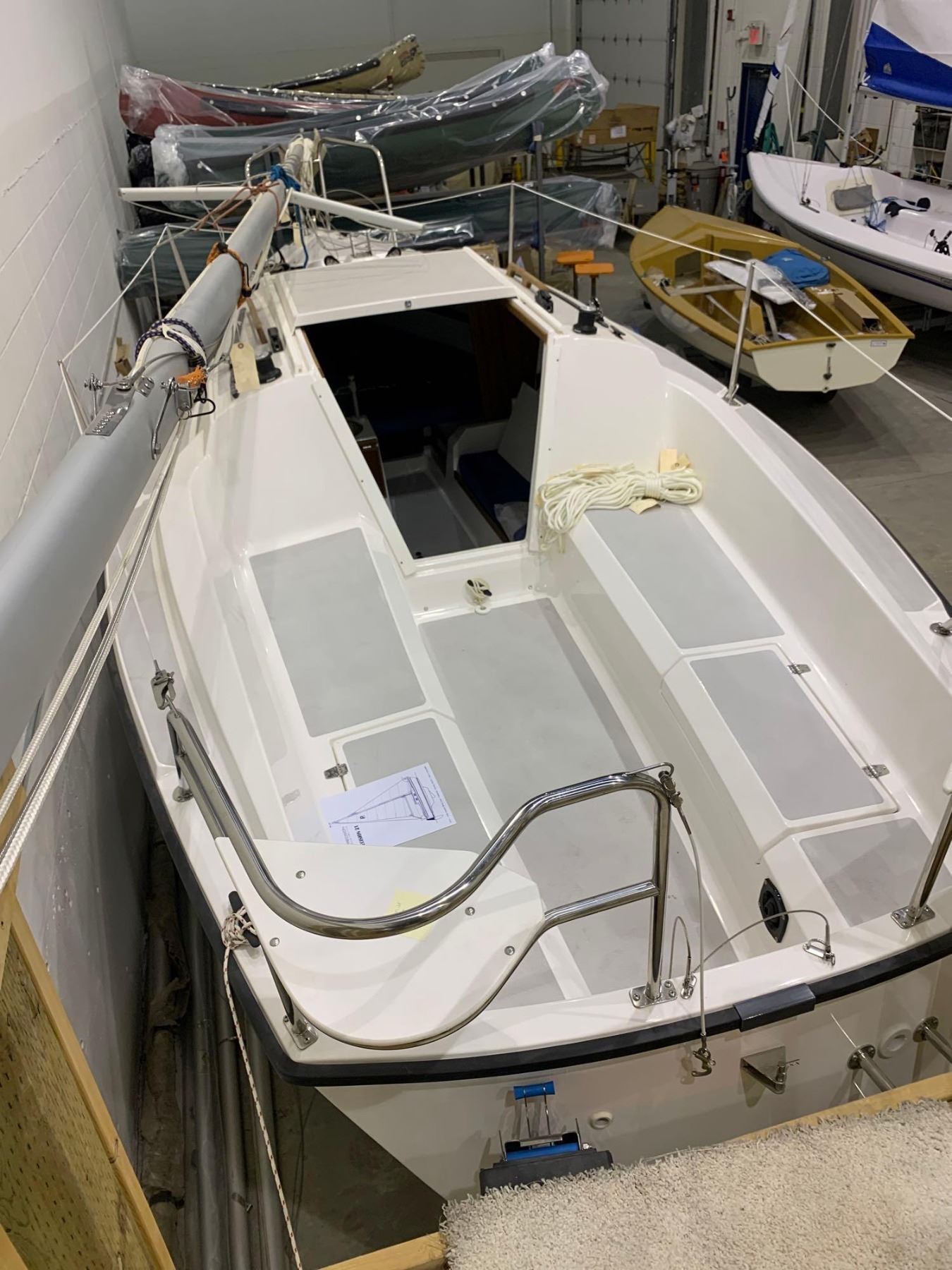 Standard Equipment Hull and Deck Iso/NPT gel coat finishHand laminated fiberglass constructionMolded in non-skid surfaceShoal draft keel with fiberglass centerboardInternal lead ballastOn deck anchor lockerMolded toe rails w/drainsOpening forward hatch4-6" mooring cleatsStainless steel bow pulpitStainless steel stern rail, stanchions & lifelinesBoarding ladderStainless steel bow eyeTeak trimAccent waterline & sheer stripesTeak handrails2 fixed and 2 opening ports Cockpit 7'1" self bailing cockpitVentilated fuel tank lockerSail lockerLaminated ash and mahogany tillerStainless steel adjustable motor mountWelded aluminum rudder headFiberglass kick-up rudder Cabin Molded 'structural grid' hull linerDeluxe fabric covered cushionsBerths for 4 adultsBackrest cushions w/shelvesShelves over v-berthsMolded storage lockers under berthsHead area located forward of bulkhead Electrical 12 volt electrical systemFused switch panelInterior lightsNavigation lightsSteaming lightBattery box Spars and Rigging Anodized mast & boom4:1 'Harken' mainsheet systemGenoa winches & handle"Harken" ball bearing blocksGenoa track with carsPrestretched Dacron halyardsSpliced halyard shacklesPrestretched Dacron sheets & running riggingSplit backstayChromed bronze open body turnbuckles w/togglesTopping liftHinged mast stepSwaged stainless steel standing rigging Galley Alcohol stoveStainless steel sinkManual water pumpStorage binsSelf contained water system48 qt. Igloo ice chest with teak step Sails Dacron main and jibJiffy reefing system with 1 reef point