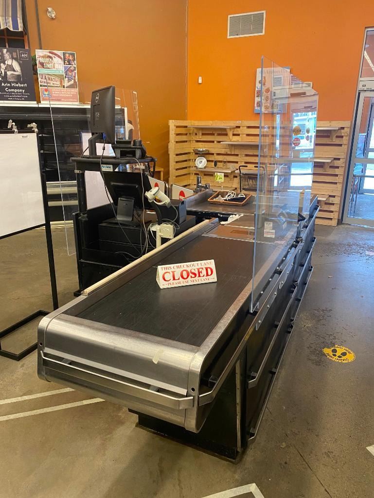 Pan Osten Check out counter stainless top with conveyor system and storage. bumper rails and plexi guard. does not include any electronics ( POS or Scale, etc)