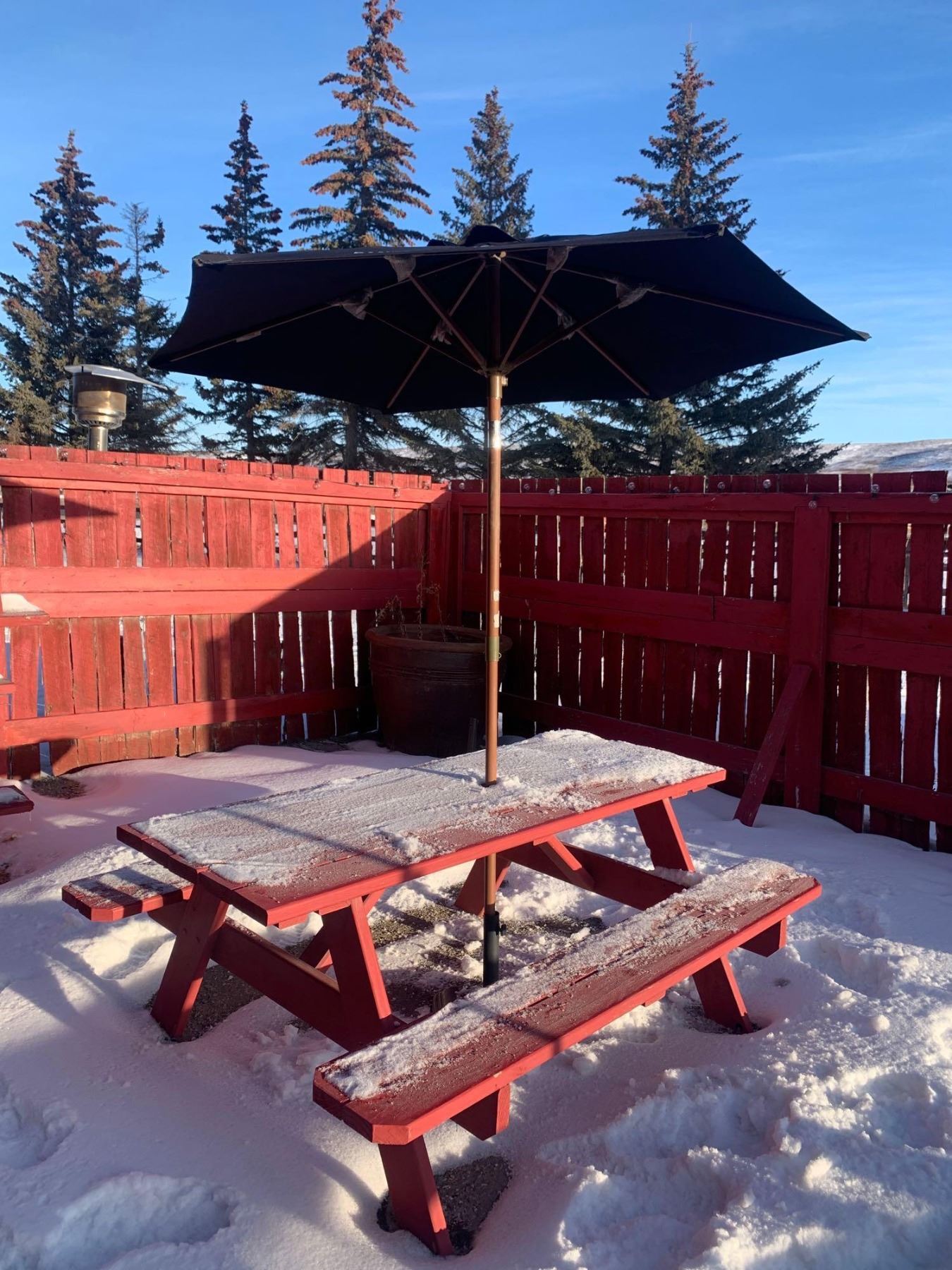 Patio Red 70 inch wood Pic Nic Table with Umbrella ( color of umbrella may be red or black)