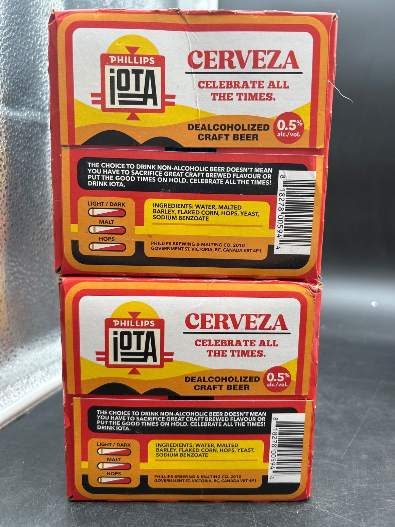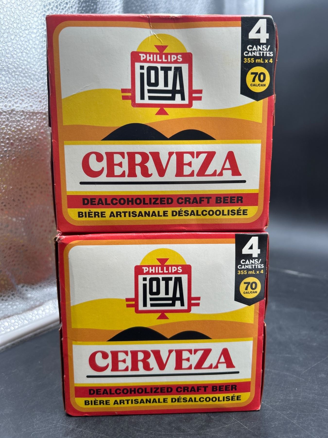 Two sets of Phillips Iota Dealcoholized Craft Beer Cerveza containing 4 cans per set, with each can having a volume of 355 mL. The alcohol by volume (ABV) is 0.5 percent. Featuring labeling in both English and French with nutritional information indicating 70 calories per can. Product crafted with water, malted barley, hops, yeast, and natural flavors.