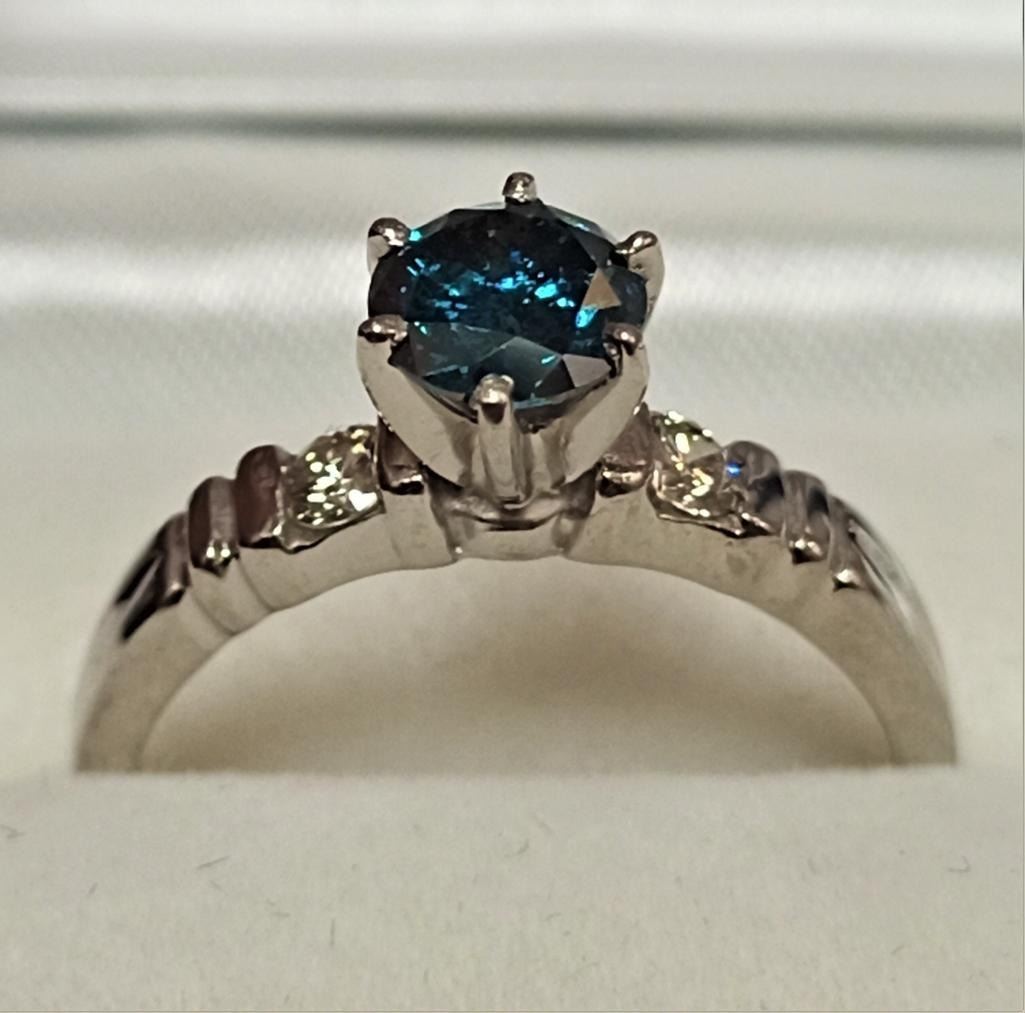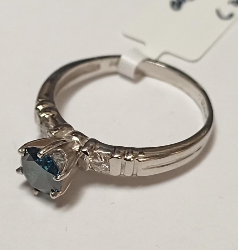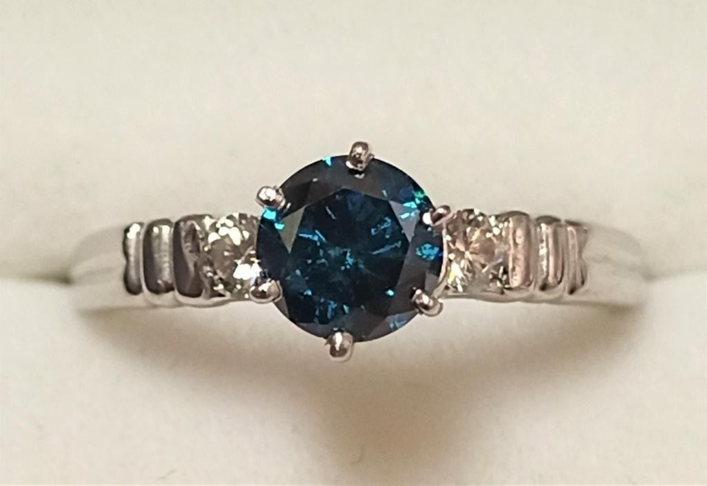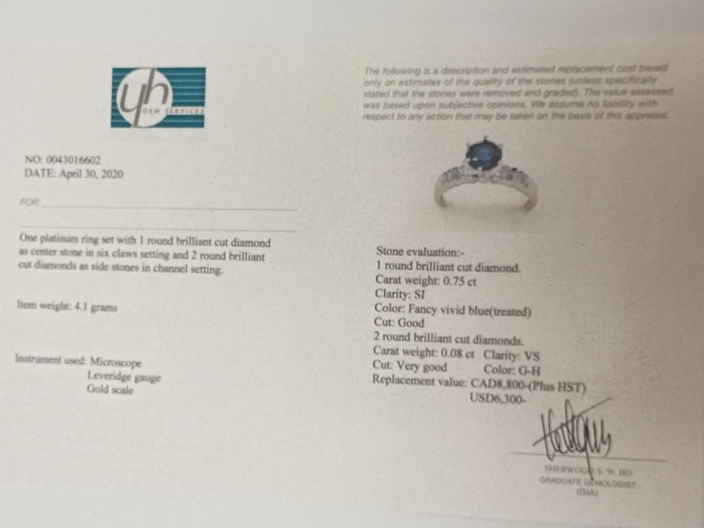 Platinum Blue Diamond(SI, 0.75ct) 2 Side Diamonds(VS, 0.08ct) Ring (~Size 6)(Ring is resizable for $40) (~weight 4.1g), Made in Canada, Insurance Value $8800