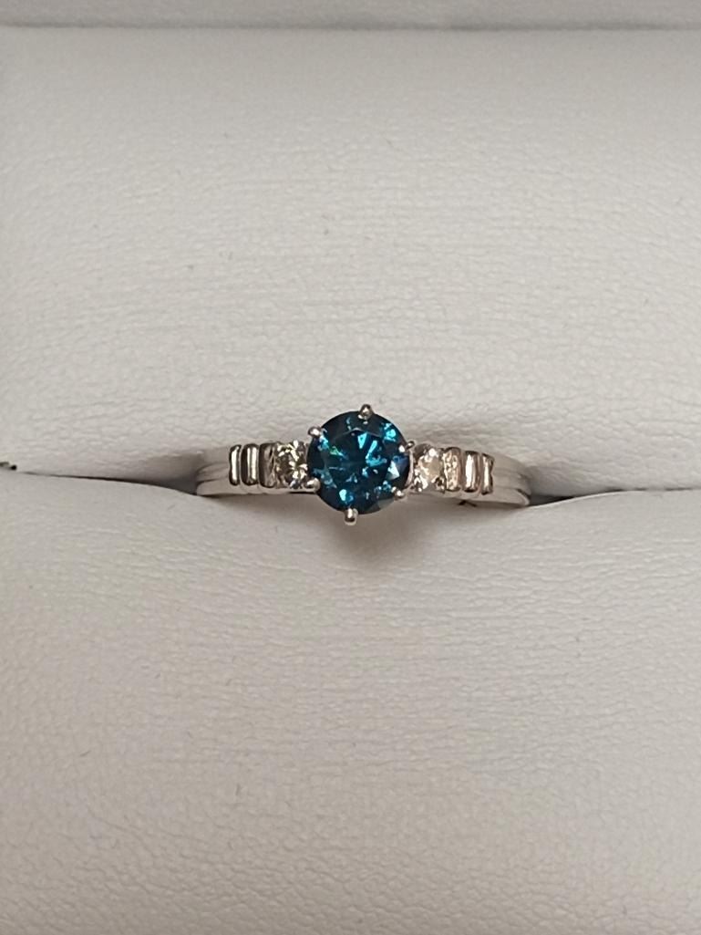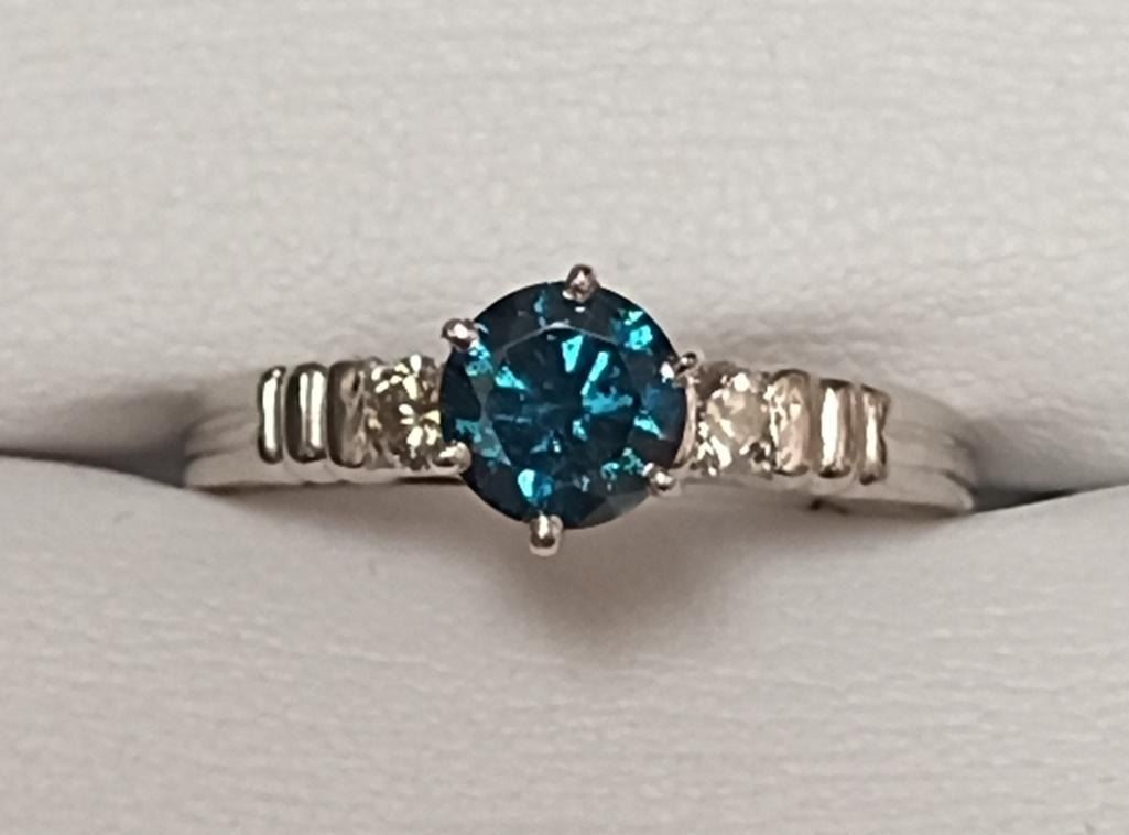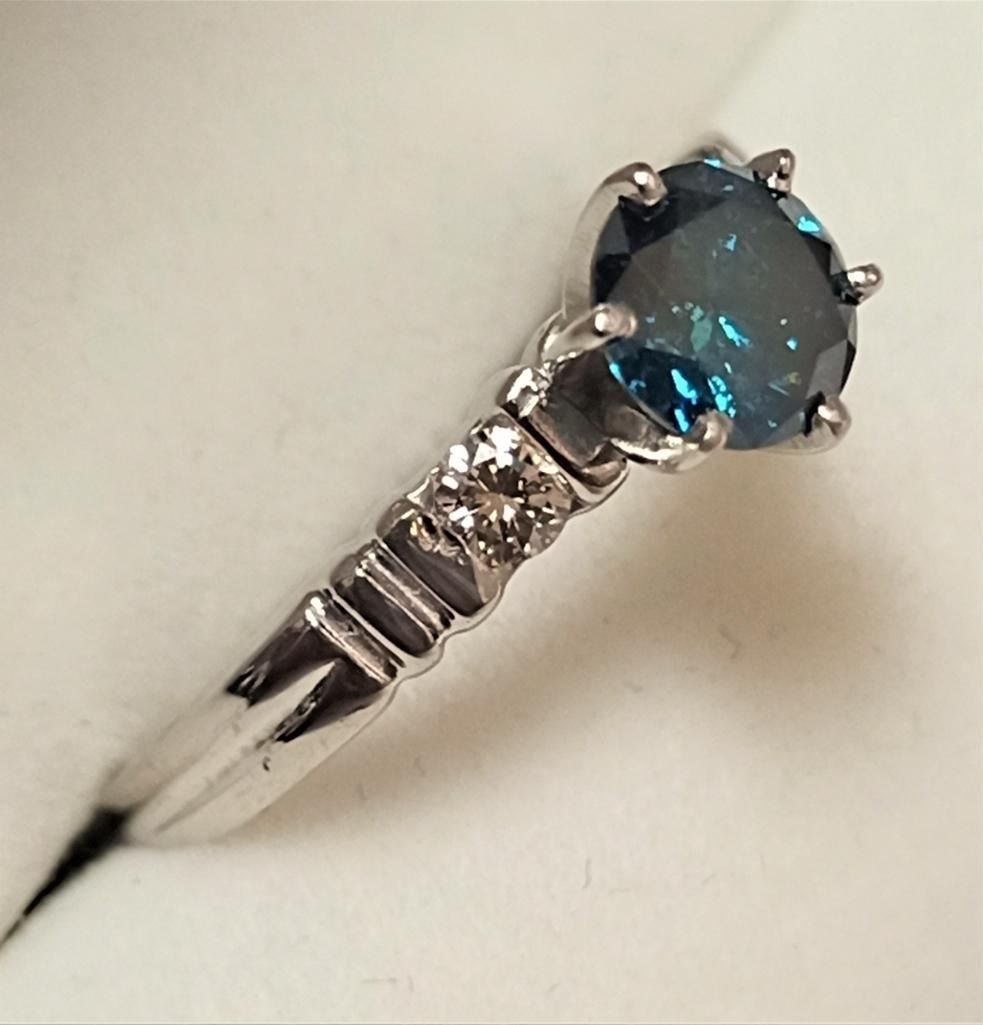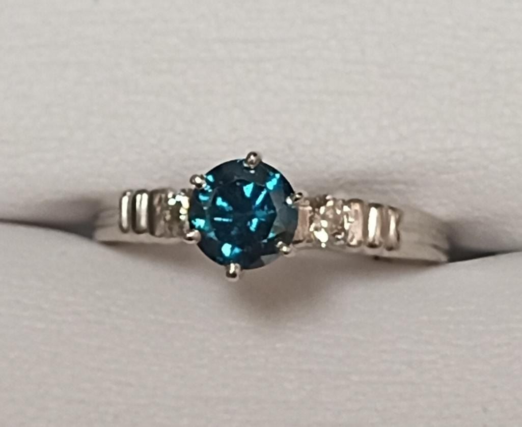 Platinum Blue Diamond(SI, 0.75ct) 2 Side Diamonds(VS, 0.08ct) Ring (~Size 6)(Ring is resizable for $40) (~weight 4.1g), Made in Canada, Insurance Value $8800