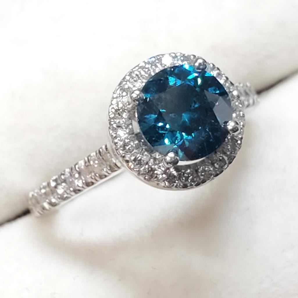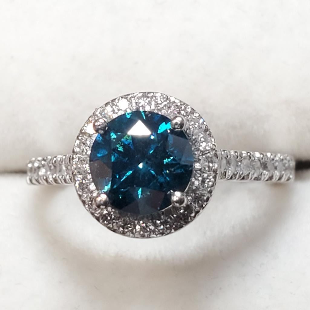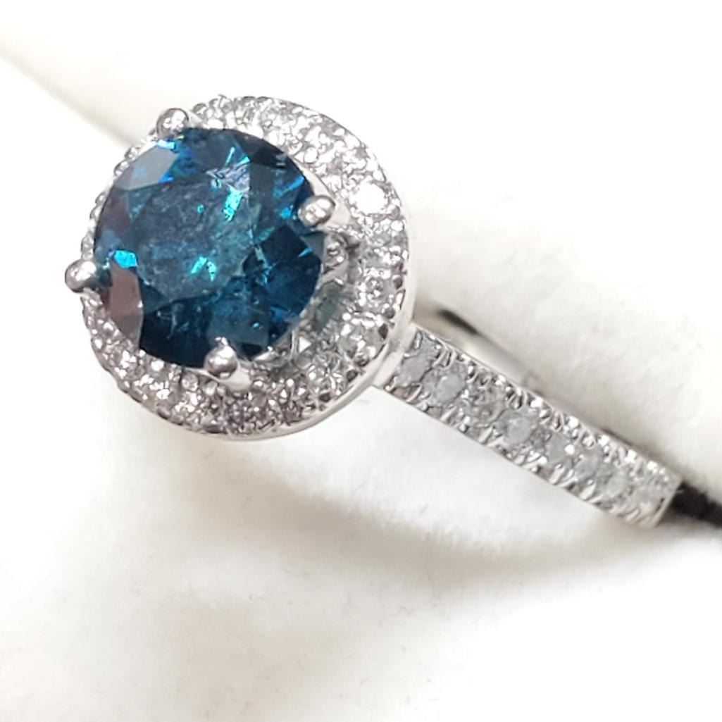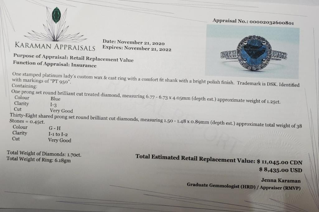 Platinum Blue Treated Diamond(1.25ct) Diamond(0.45ct) Clarity (1-3), 38 Shared Diamonds G-H Color Clarity (I-1 To I-2) Ring (~Size 6)(Ring is resizable for $40) (~weight 6.18g), Made in Canada, Appraised Retail $11045 (Estimated Selling Price from $2400 to $4800)
