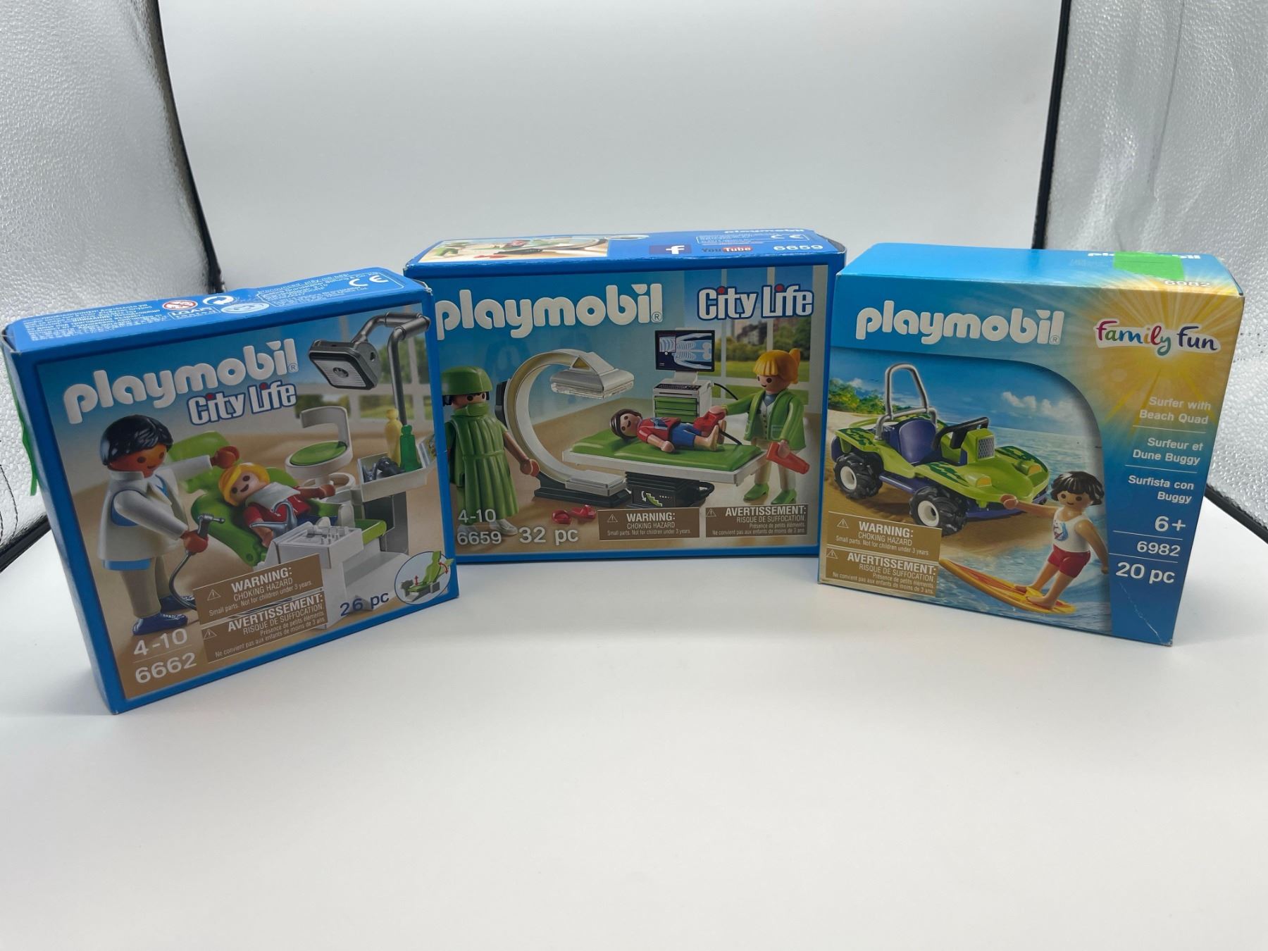 Playmobil City Life Dentist #6662 26pcs & X-Ray #6659 32pcs & Family Fun Surfer with Beach Quad #6982 20pcs