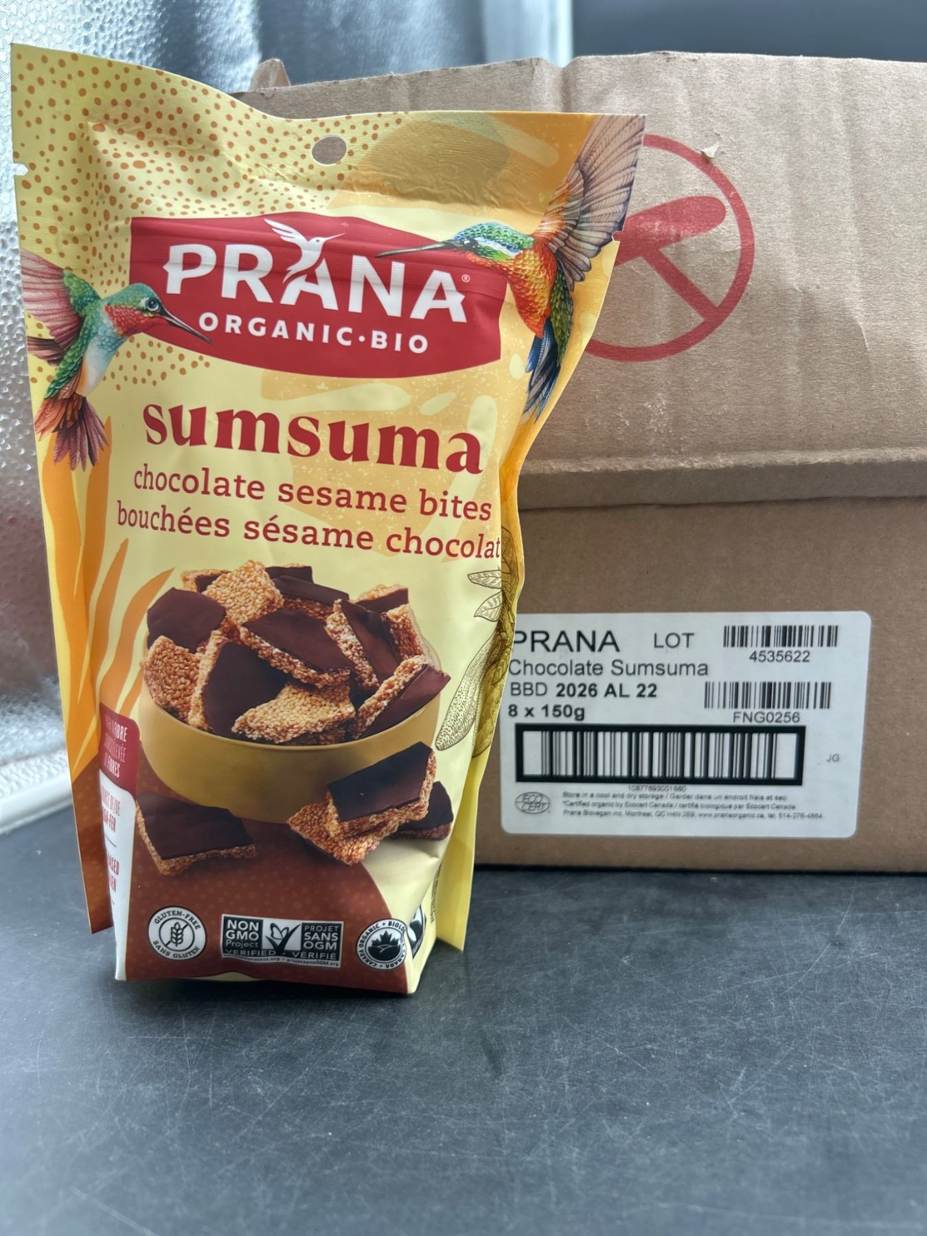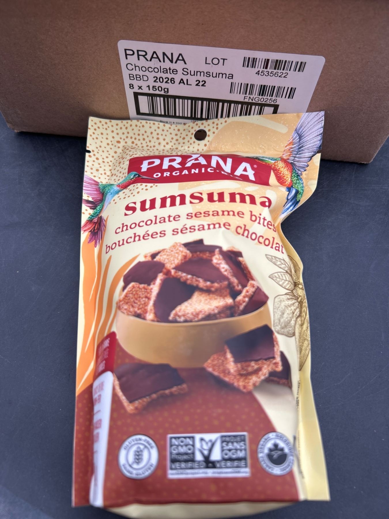 Prana Organic Bio Sumsuma Chocolate Sesame Bites in 8 packs of 150g each. The product is denoted as non-GMO and certified organic. Lot details include LOT: 4352522 with BBD labeled as 2026 AL 22. Ideal for distribution and bulk uses.