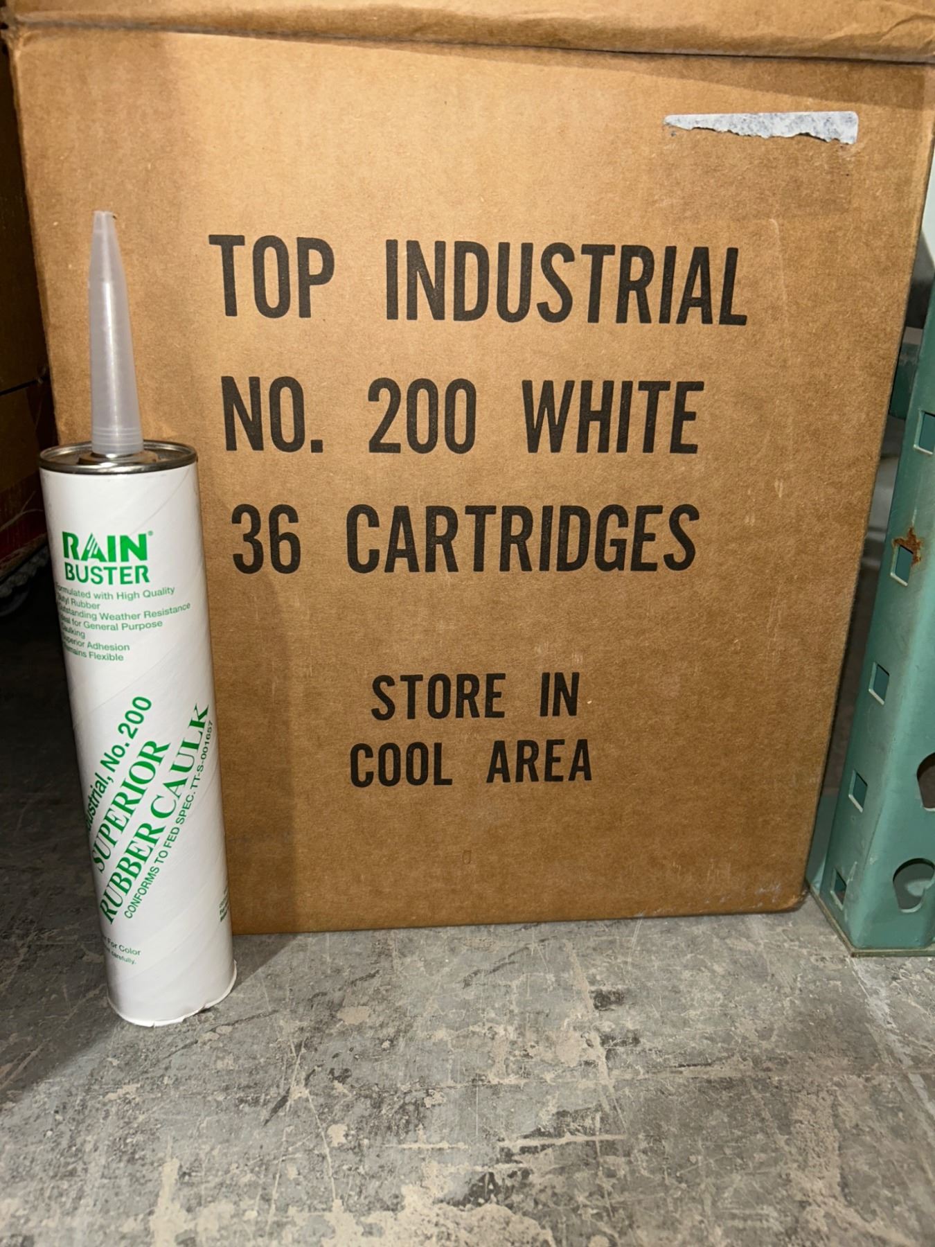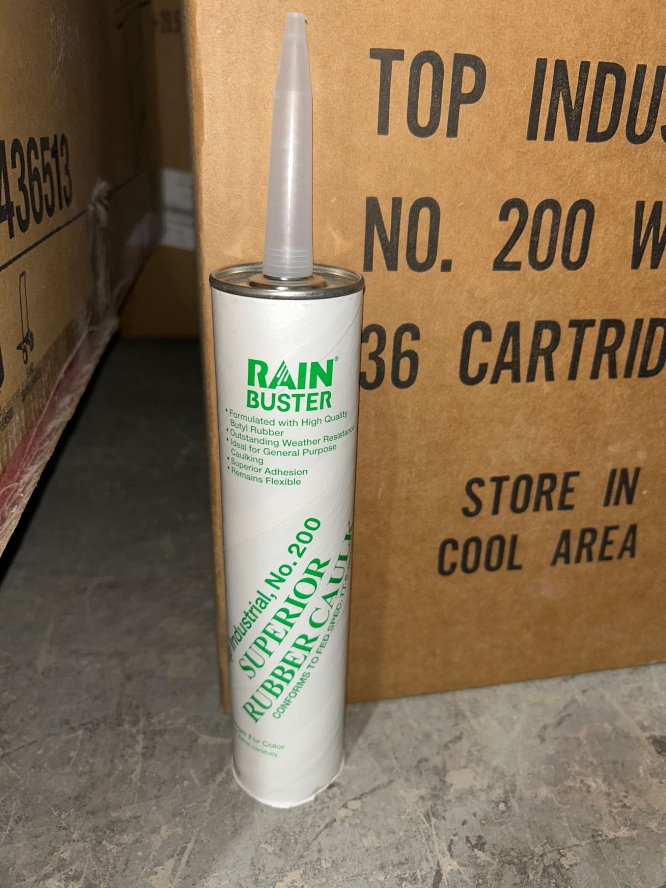 Rain Buster Superior Rubber Caulk Industrial No. 200 White. The lot consists of a total of 36 cartridges. Product is clearly marked for use in cool areas. Ideal for a variety of industrial and professional applications requiring durable and reliable caulking.
