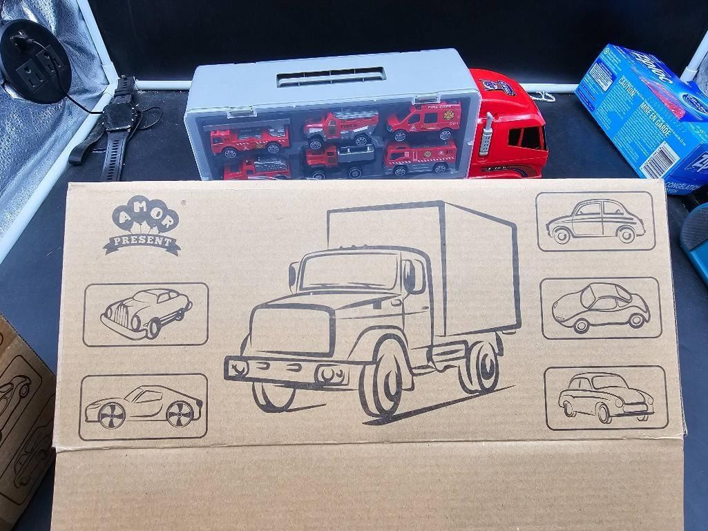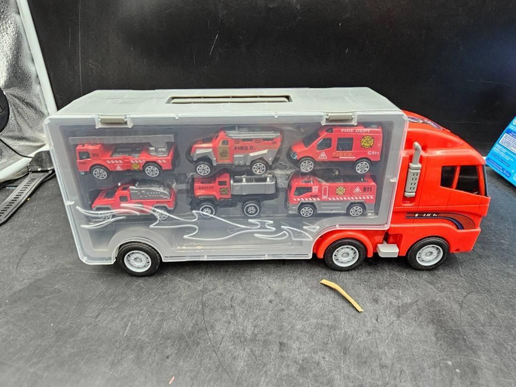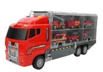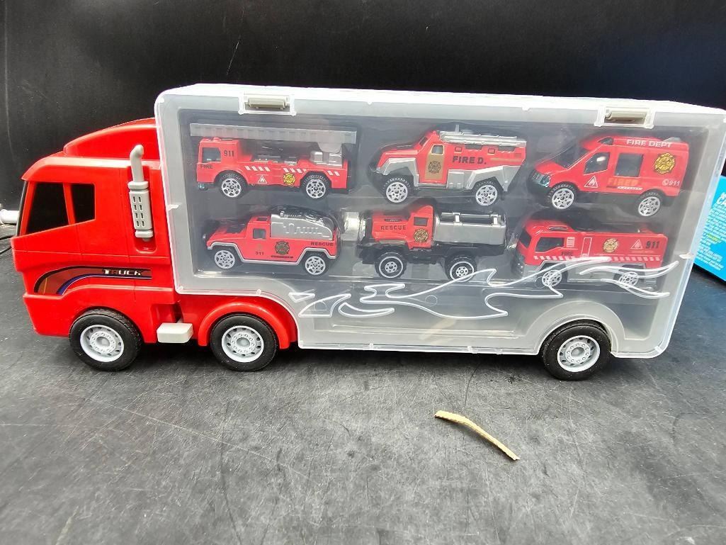 Red Transport Truck Toy With 12 small Firefighting Vehicles and Lego Style  Figures