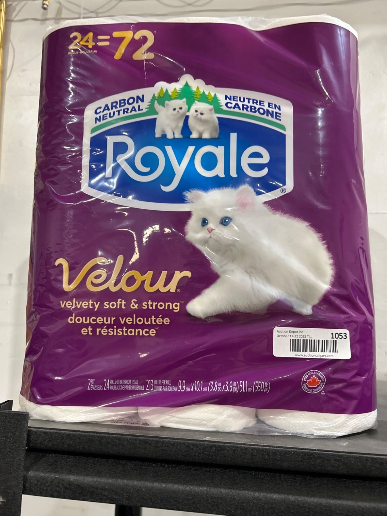Royale Velour Toilet Paper, carbon neutral variety. Includes 24 rolls, with a 24 = 72 count equivalence. Features a velvety soft and strong texture. Suitable for bathroom use. Packaging references code 1053 on the label.