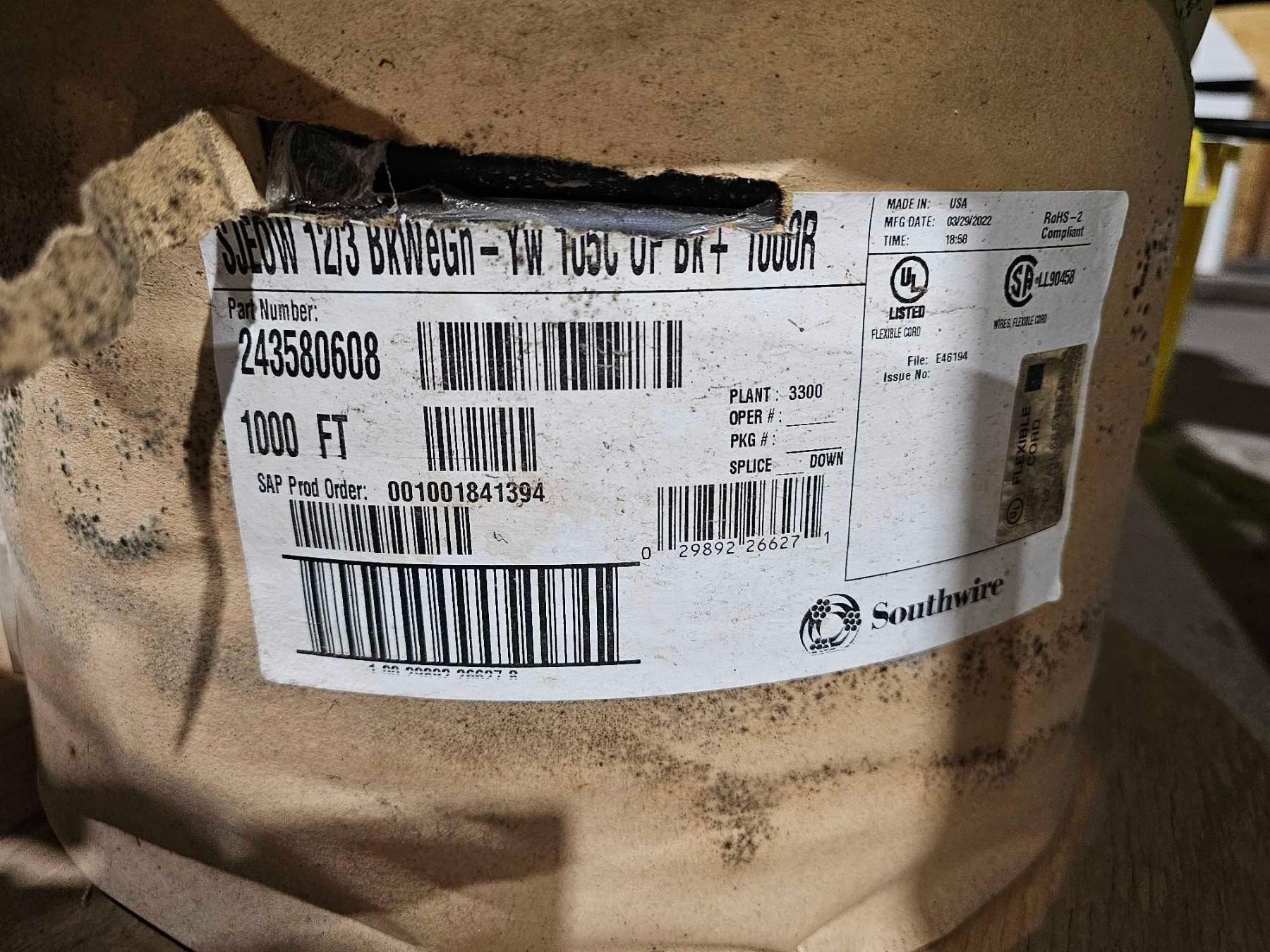 SJEOW 12/3 BKWEGn-YW1050 OF DK+ Flexible Wire /Cord 1000 Ft Spool