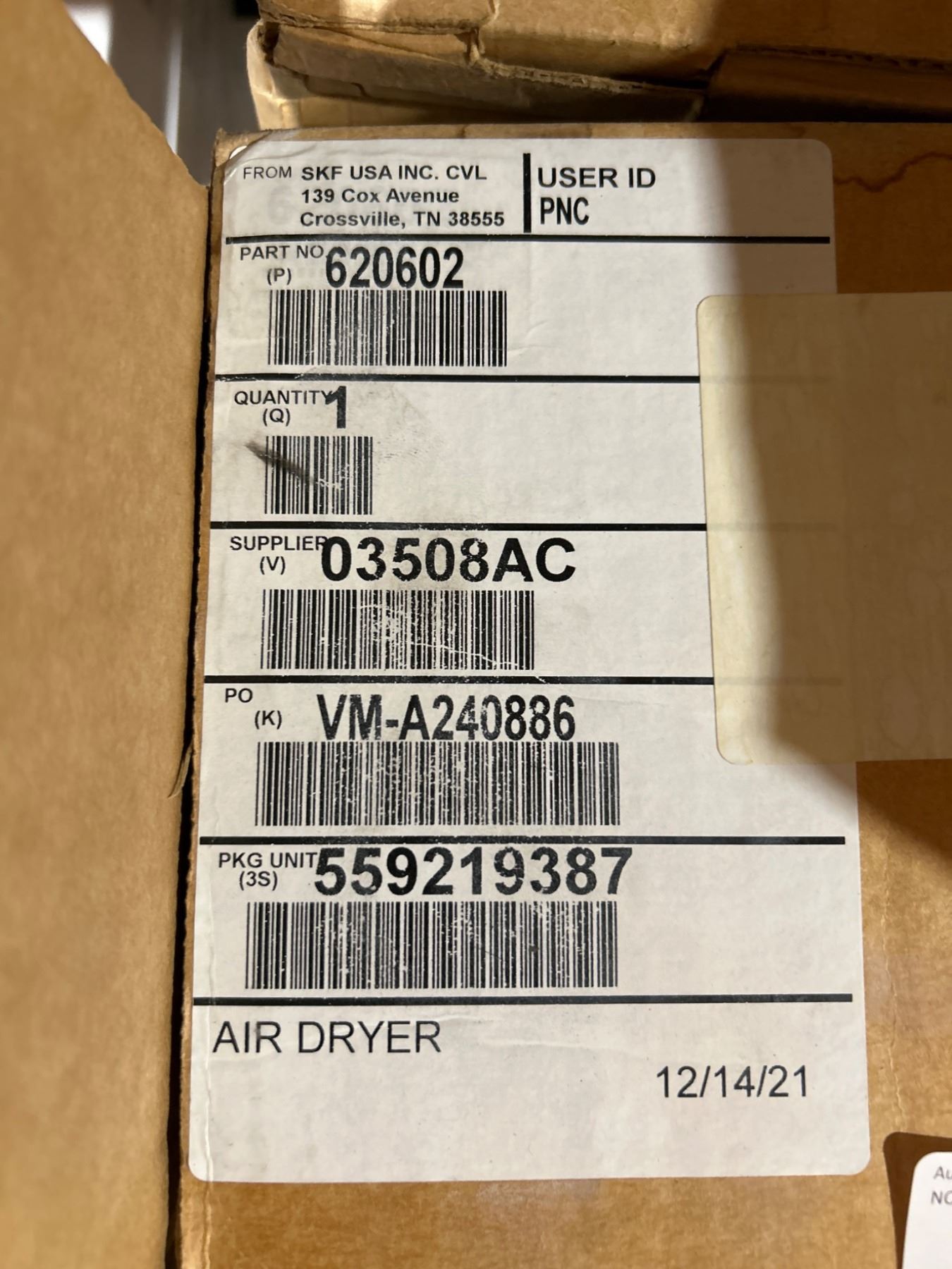 SKF Air Dryer, Part No. 620602, Model 03508AC, PO VM-A240886
