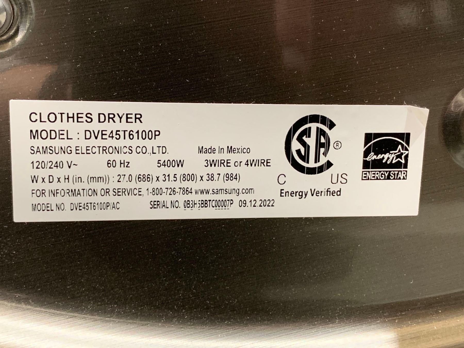 Samsung Dryer 7.5 cu. ft. Electric Dryer DVE45T6100P