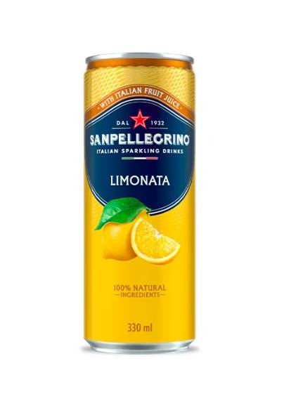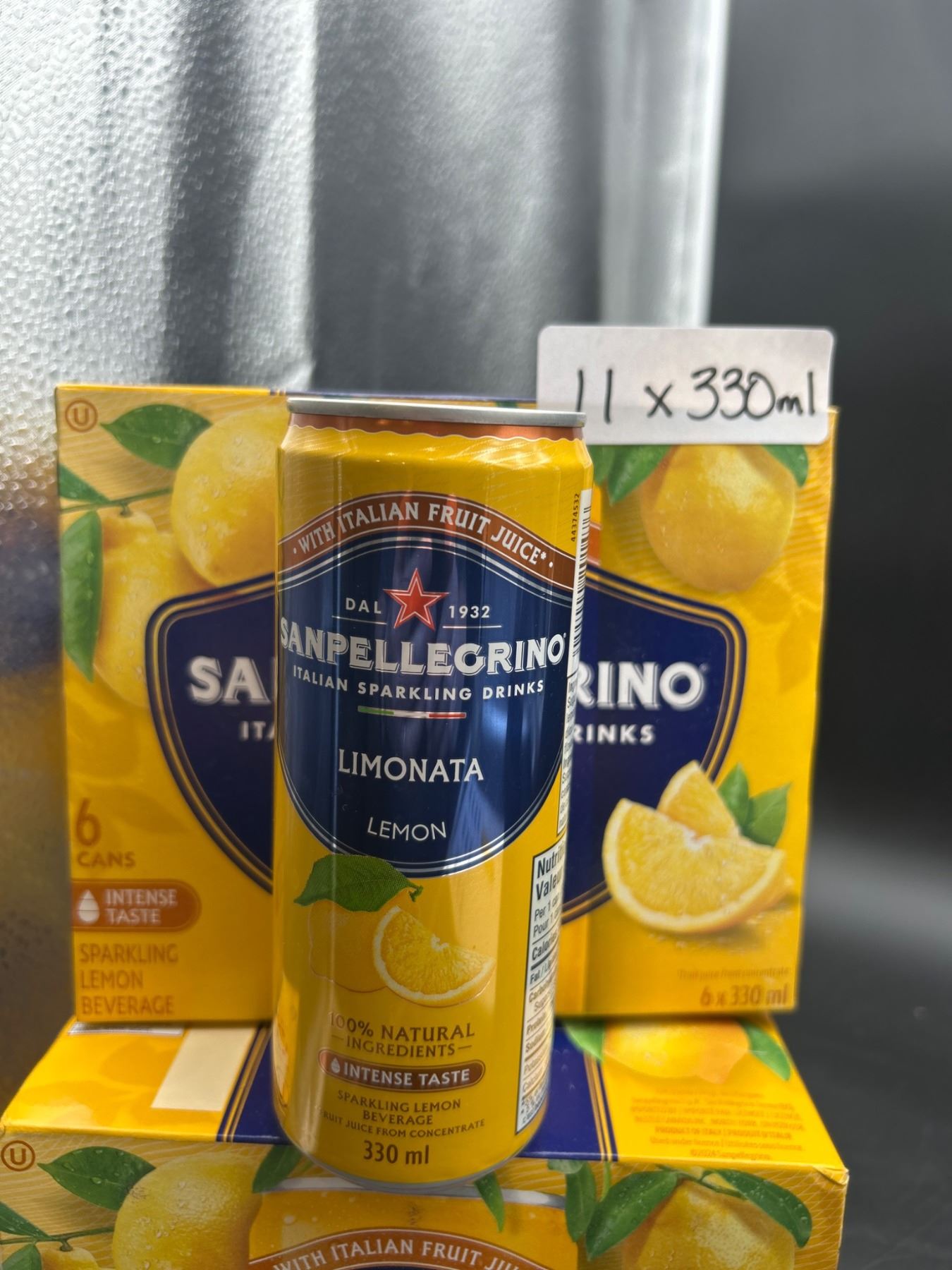 This lot consists of 11 cans of Sanpellegrino Limonata sparkling lemon drink, each containing 330ml. The drink is noted for its sparkling lemon flavor and contains 16% natural lemon juice. The lot indicates an arrangement of cans typically sold in sets of six, with a total of 11 cans included.