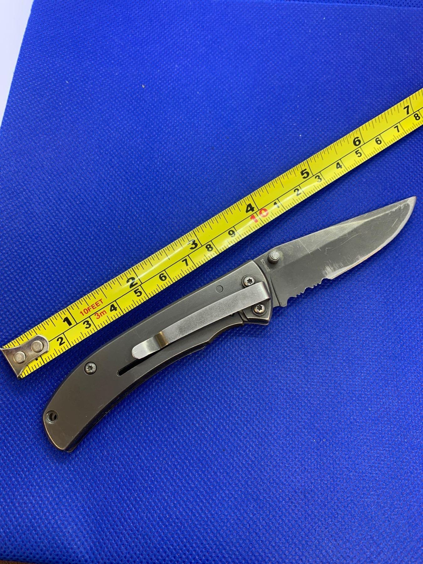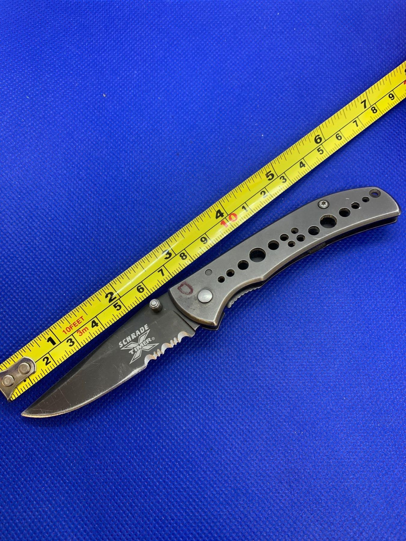 Schrade folding pocket knife with clip.
