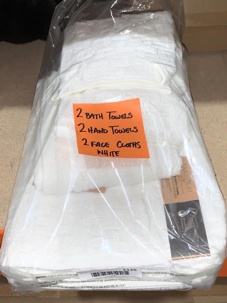 Set of White Towels: Bath, Hand, and Face Cloths includes two bath towels, two hand towels, and two face cloths