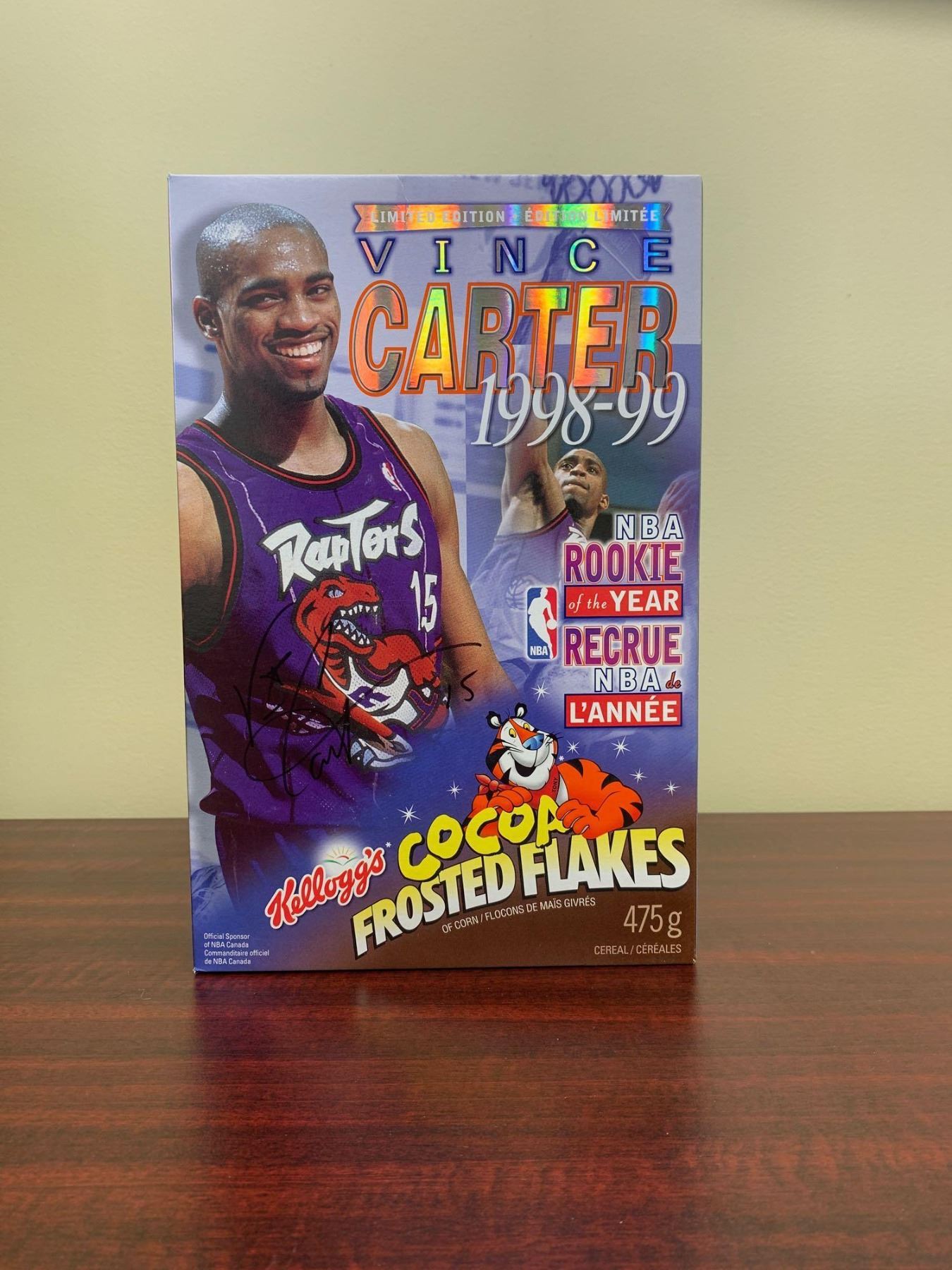 Signed Vince Carter Rookie of the Year Cocoa Frosted Flakes.