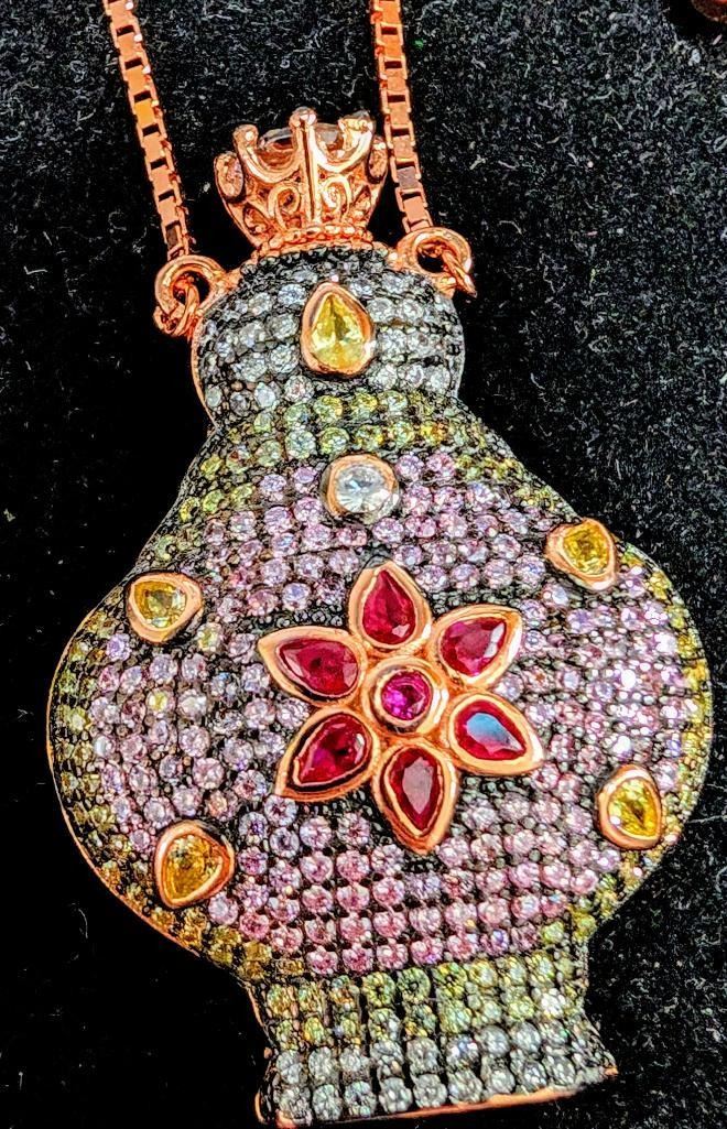 Silver 18G Perfume Bottle With Multi Color Stone Adjustable Length Necklace (~Size 0) (~length 0 inches), Suggested Retail Value $600