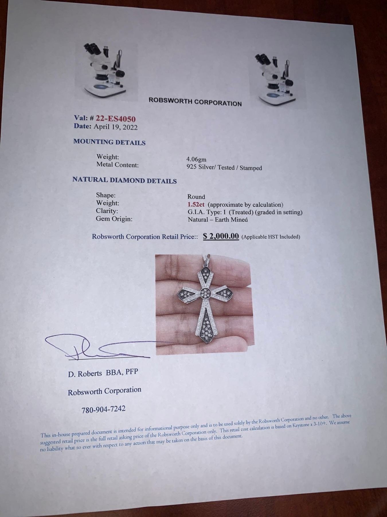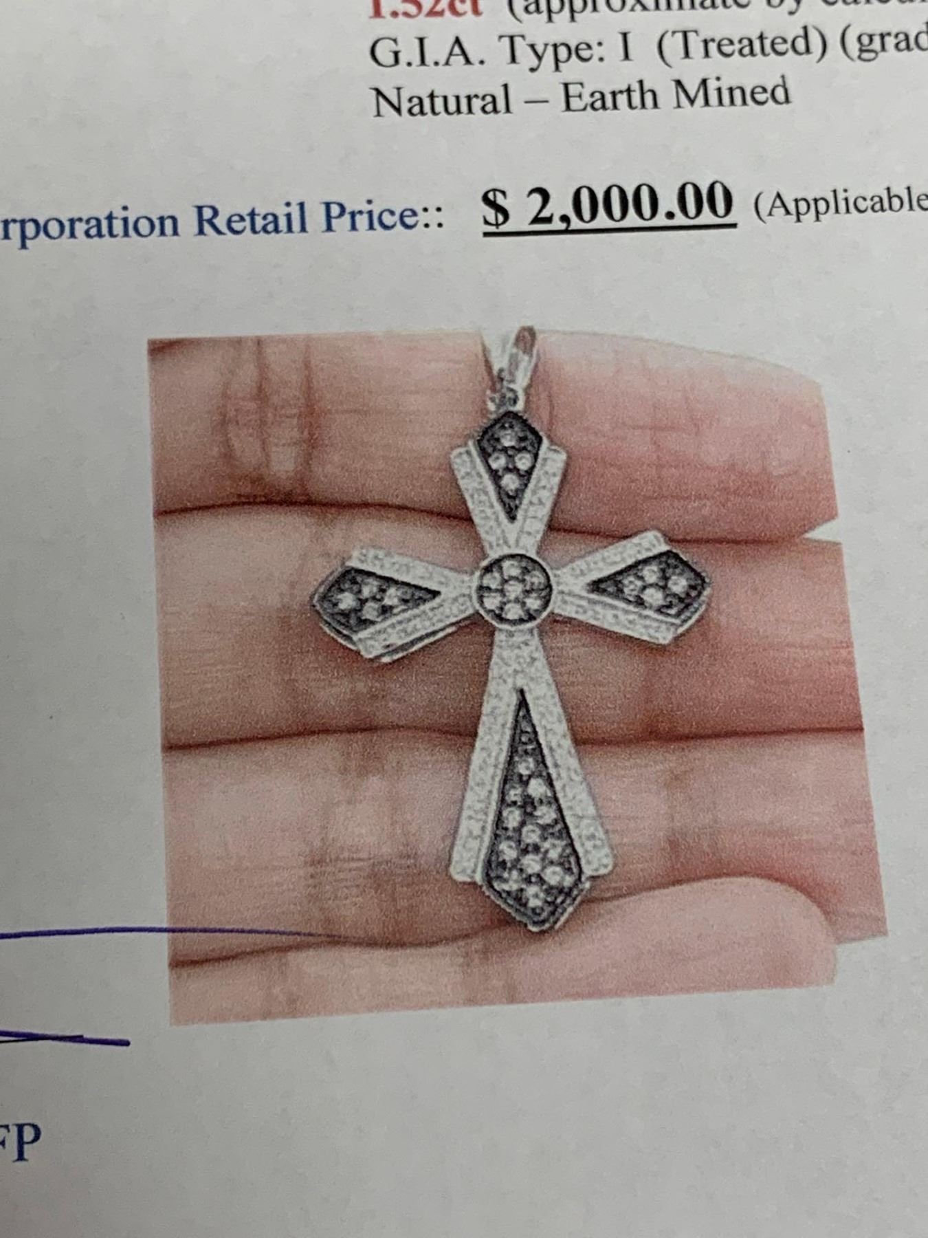 Silver .925 and diamond surfaced 1.52 carat cross pendant with Certificate Value $2000.00