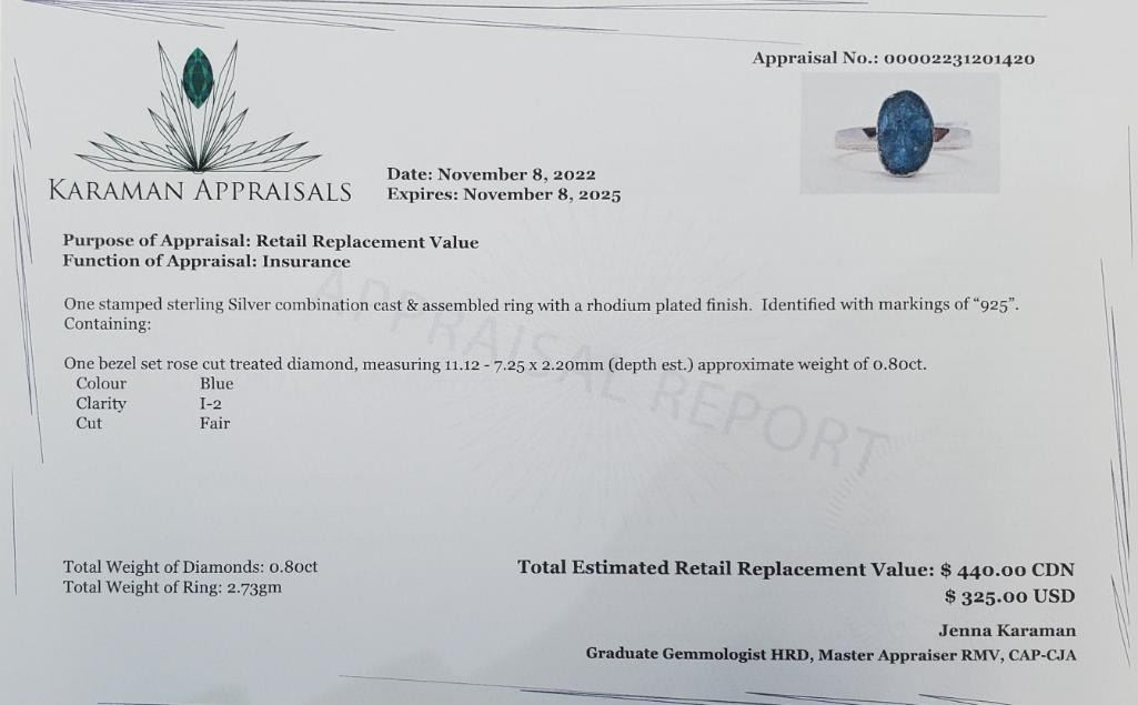 Silver Blue Diamond (0.8ct) Rhodium Plated Ring (~weight 2.7g), with Appraisal Certificate $440.00