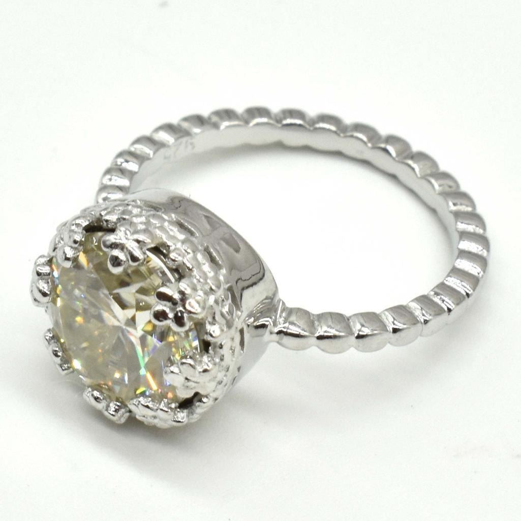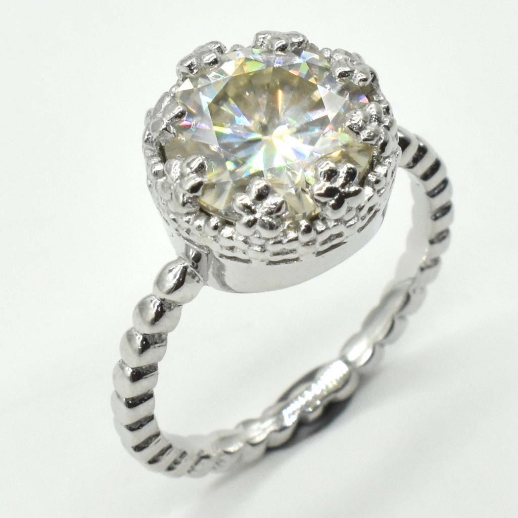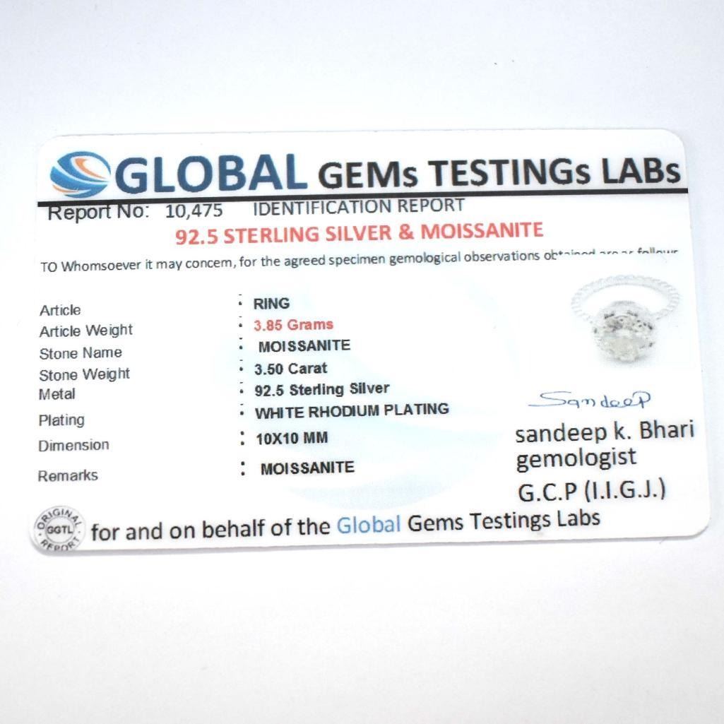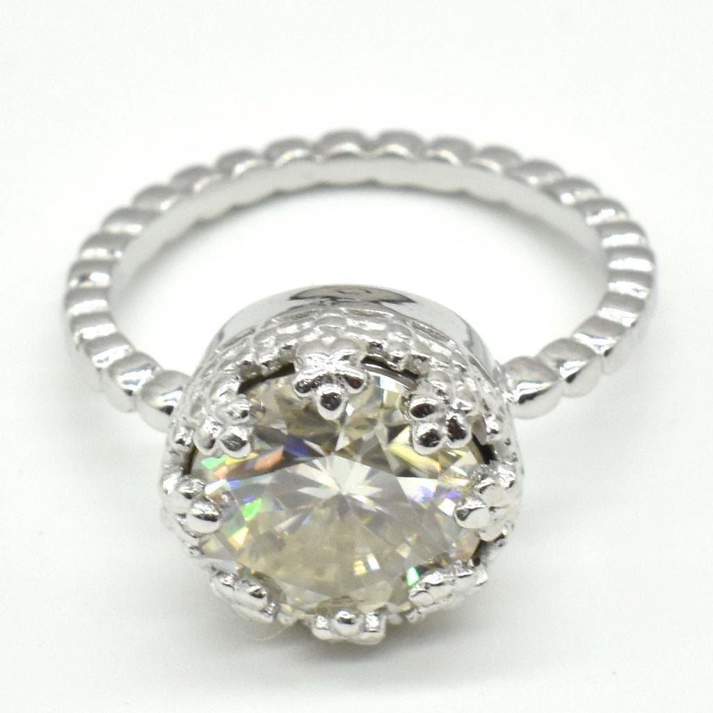 Silver Certified Moissanite(Round 10 Mm)(3.85ct) Rhodium Plated Test And Looks Better Than Diamond (Us 7) Ring (~weight 3.85g), Appraised Retail $1200