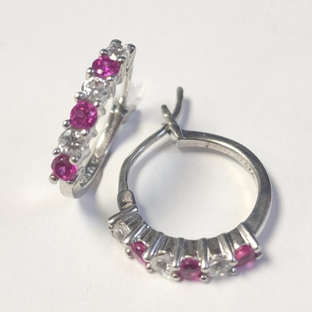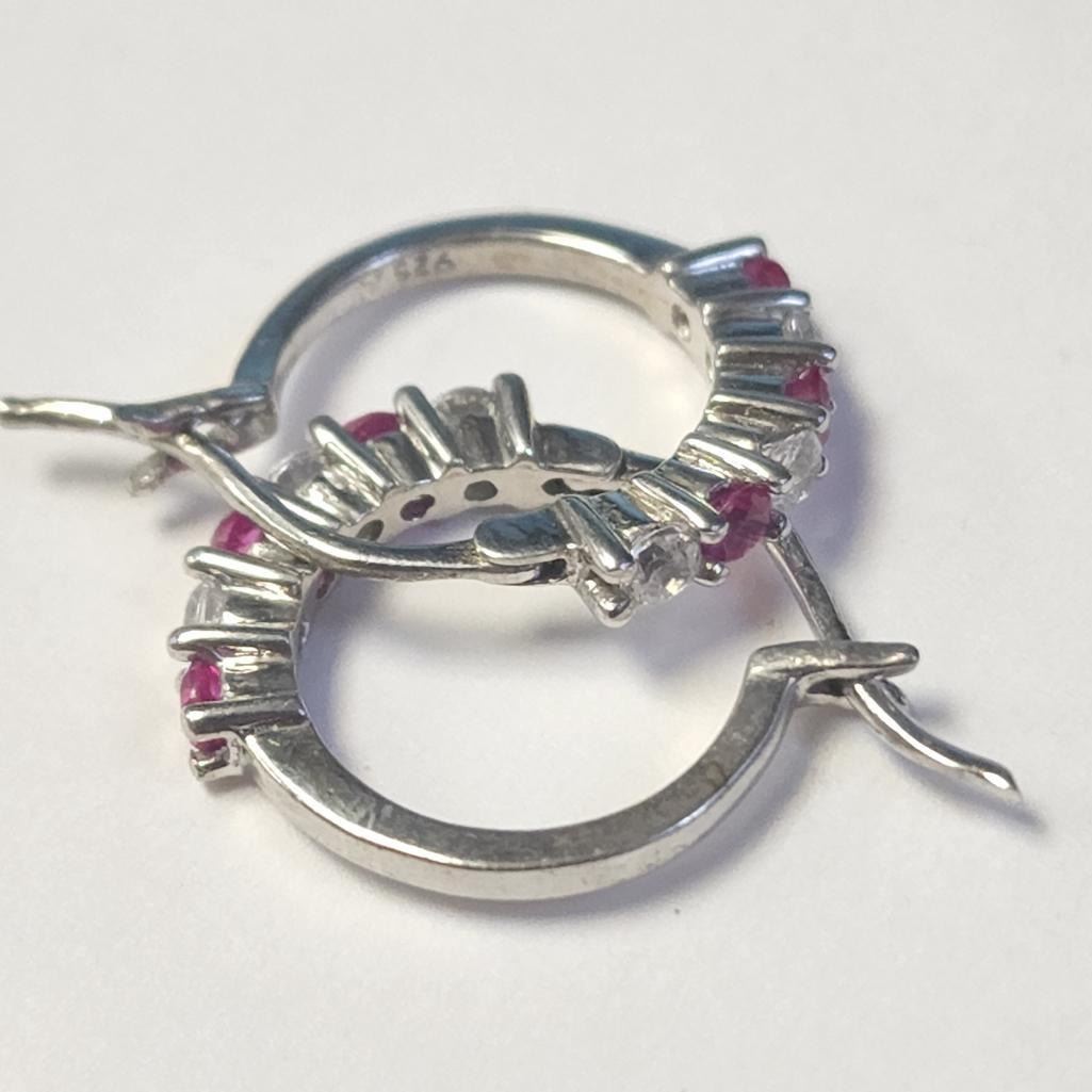 Silver Created Ruby Hoop Earrings (~Size )(Ring is resizable for $40) (~length inches), Suggested Retail Value $29