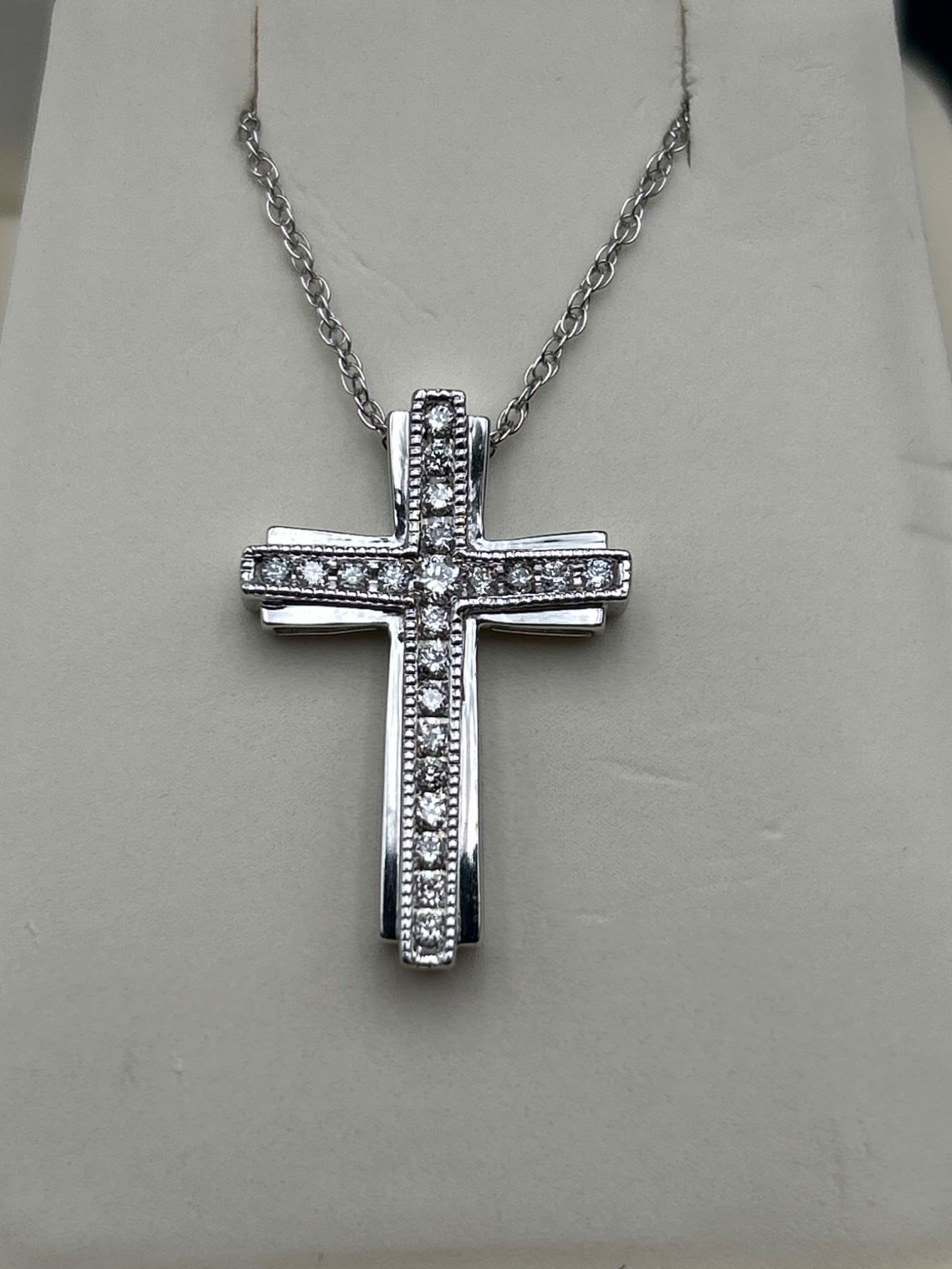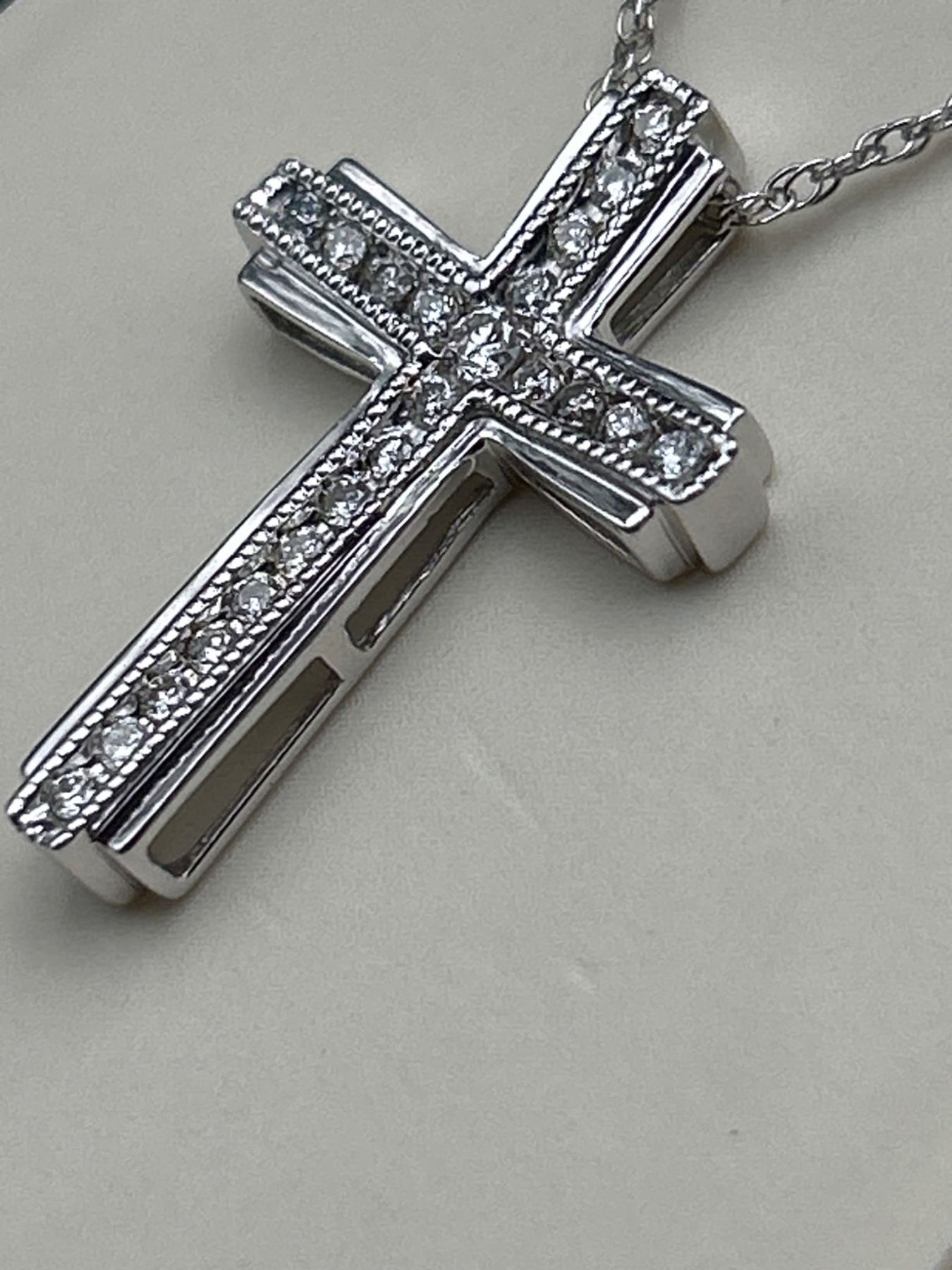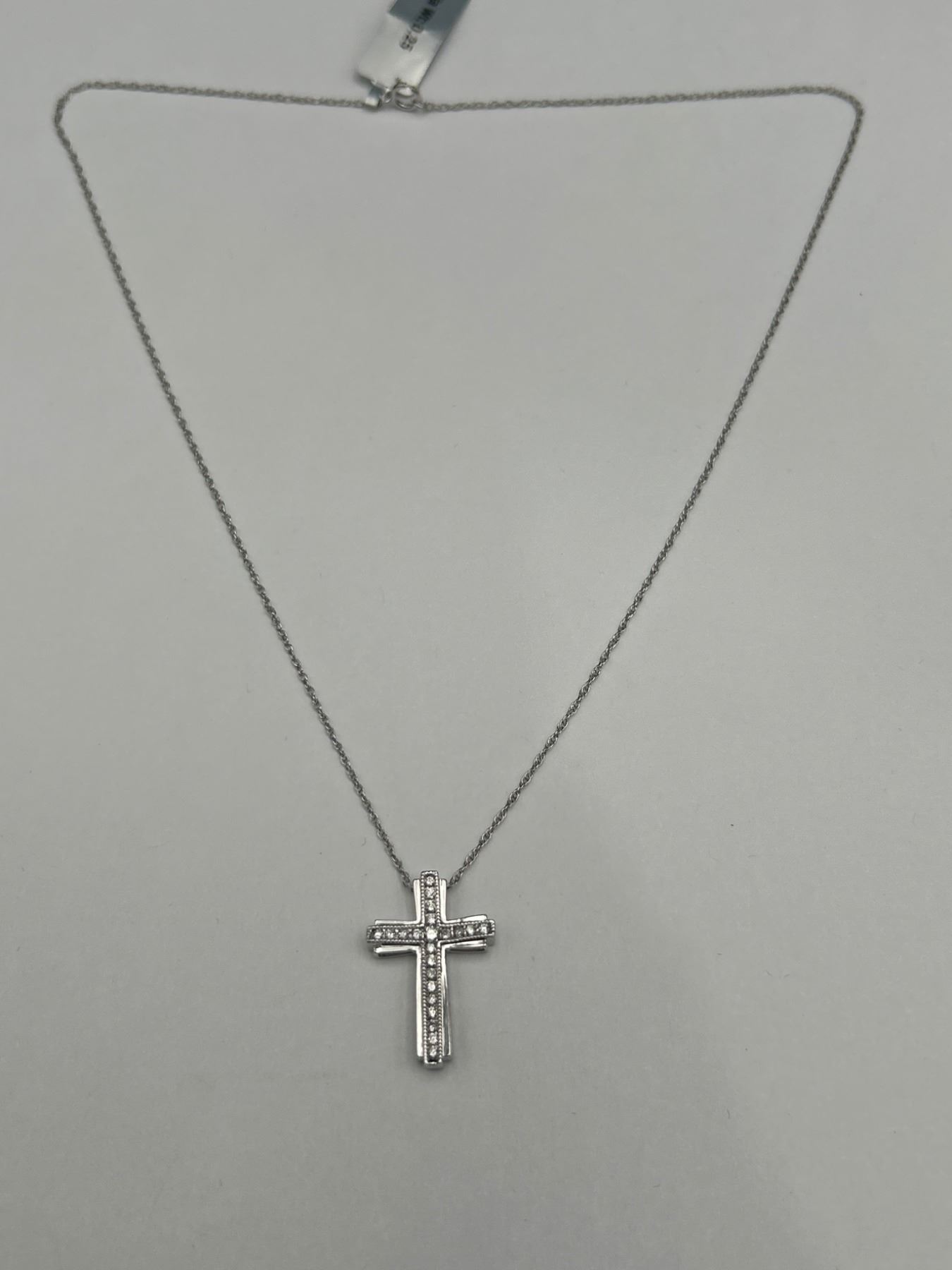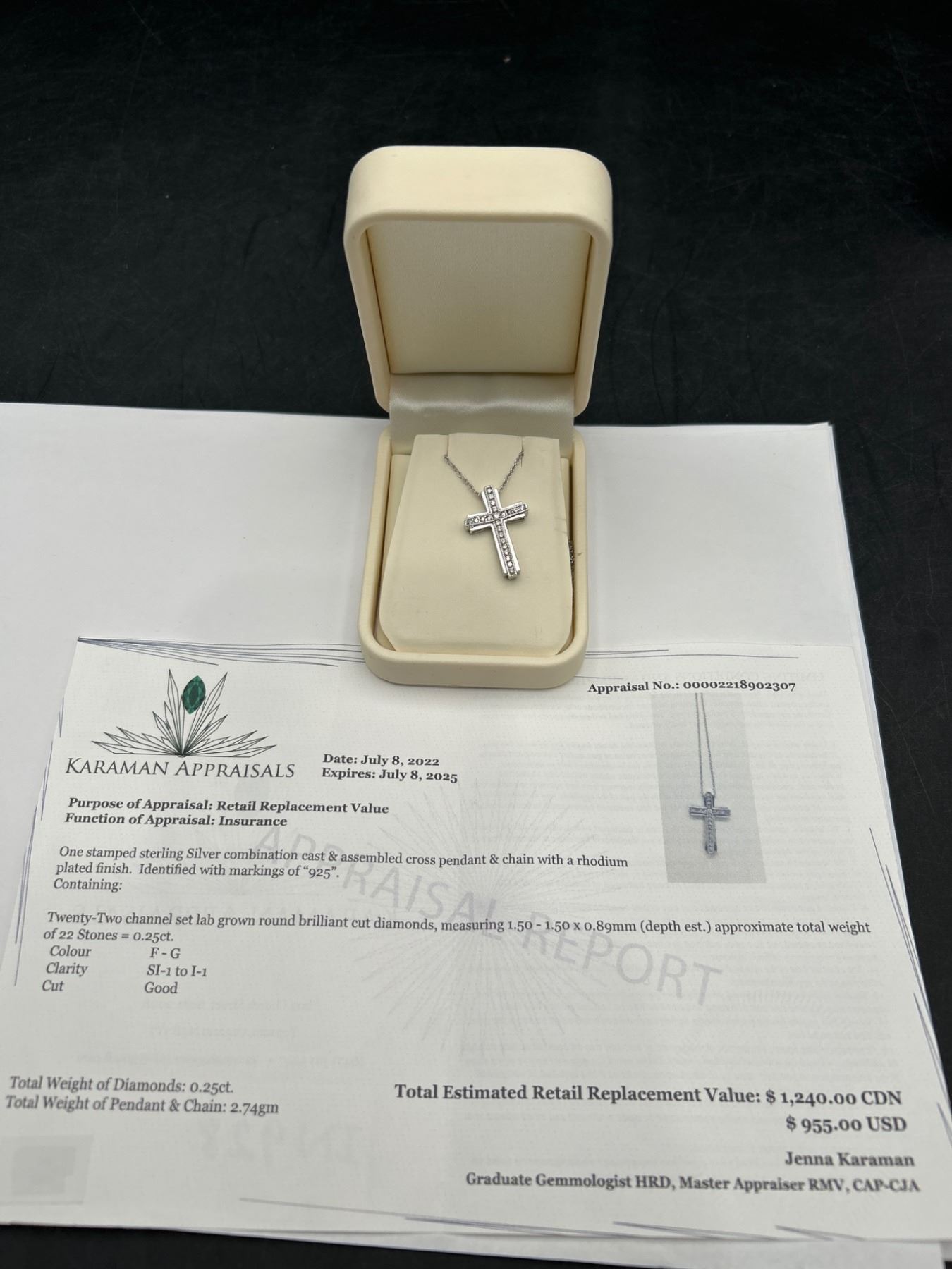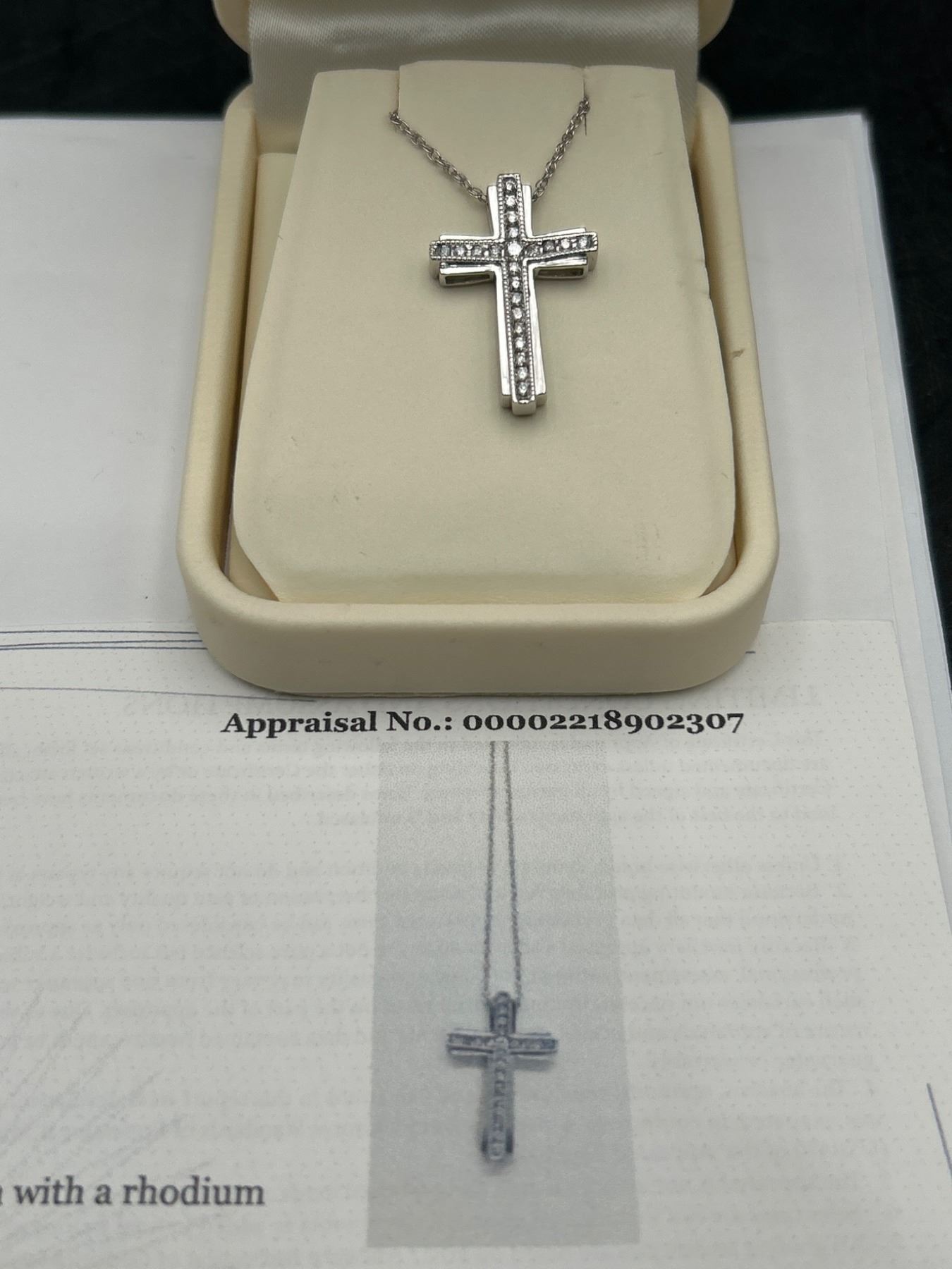 A .925 Silver cross pendant featuring diamonds with a total weight of approximately 2.74 grams The cross is suspended on a chain with a twisted rope design. The included appraisal document states a total estimated retail replacement value of $1,240.00 CAD. The pendant is constructed with rhodium for enhanced visual finish and durability. Appraisal number: 00002218902307.
