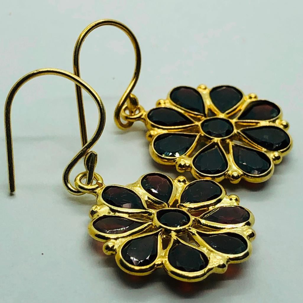 Silver Gold Plated Garnet Flower Shaped Earrings, Suggested Retail Value $160