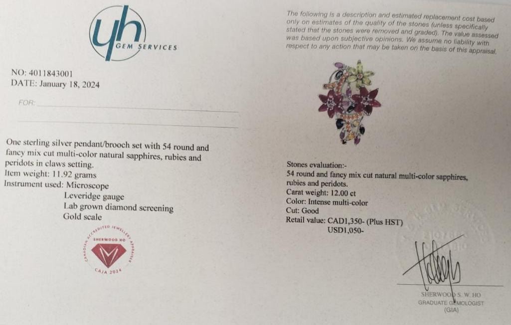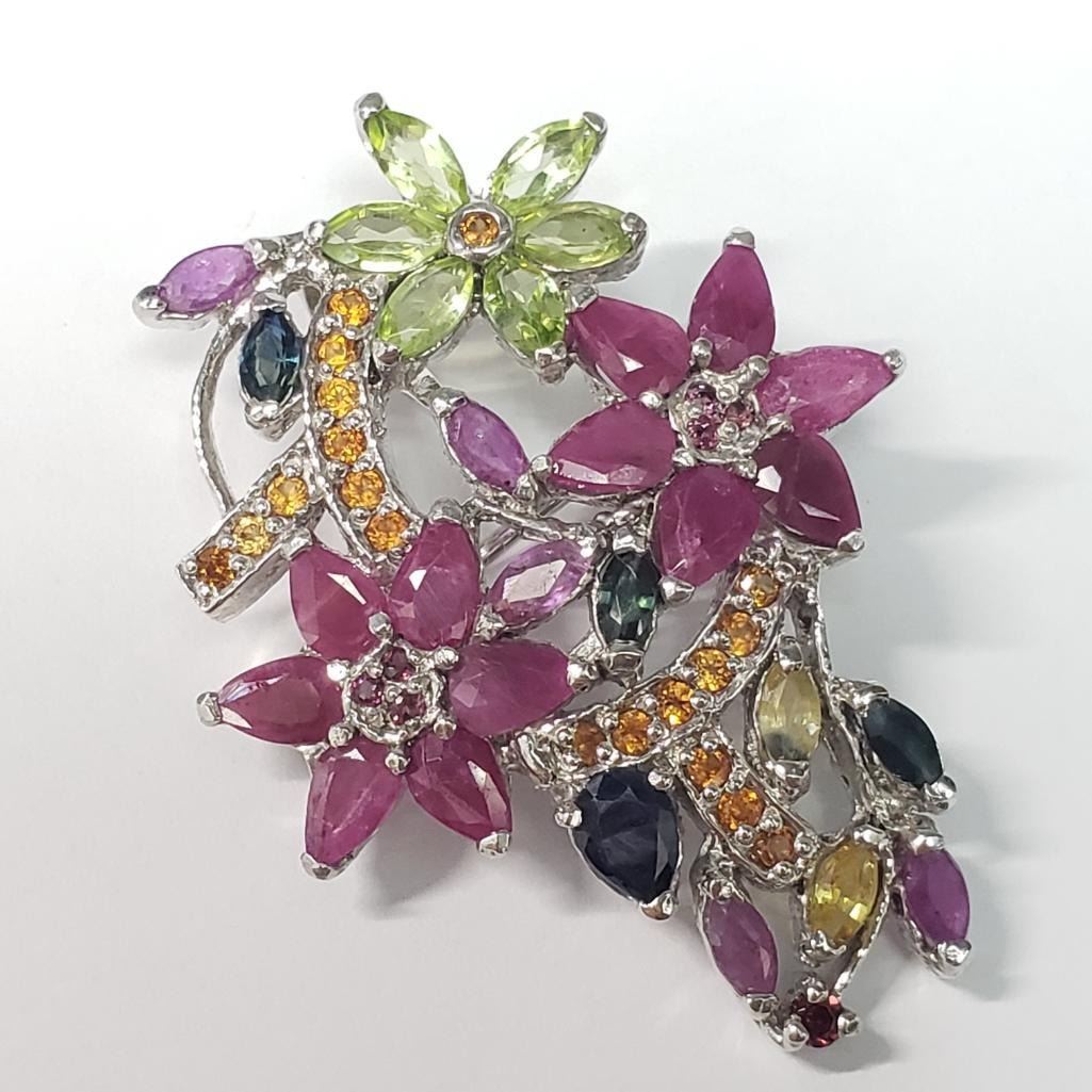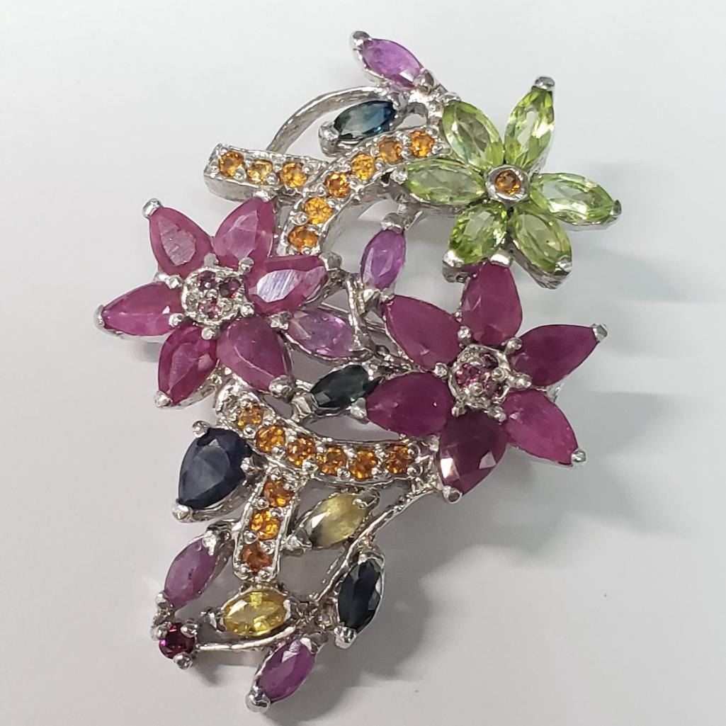 Silver Natural Multi Color Sapphire(12ct) Brooch (~weight 11.92g), Appraised Retail $1350