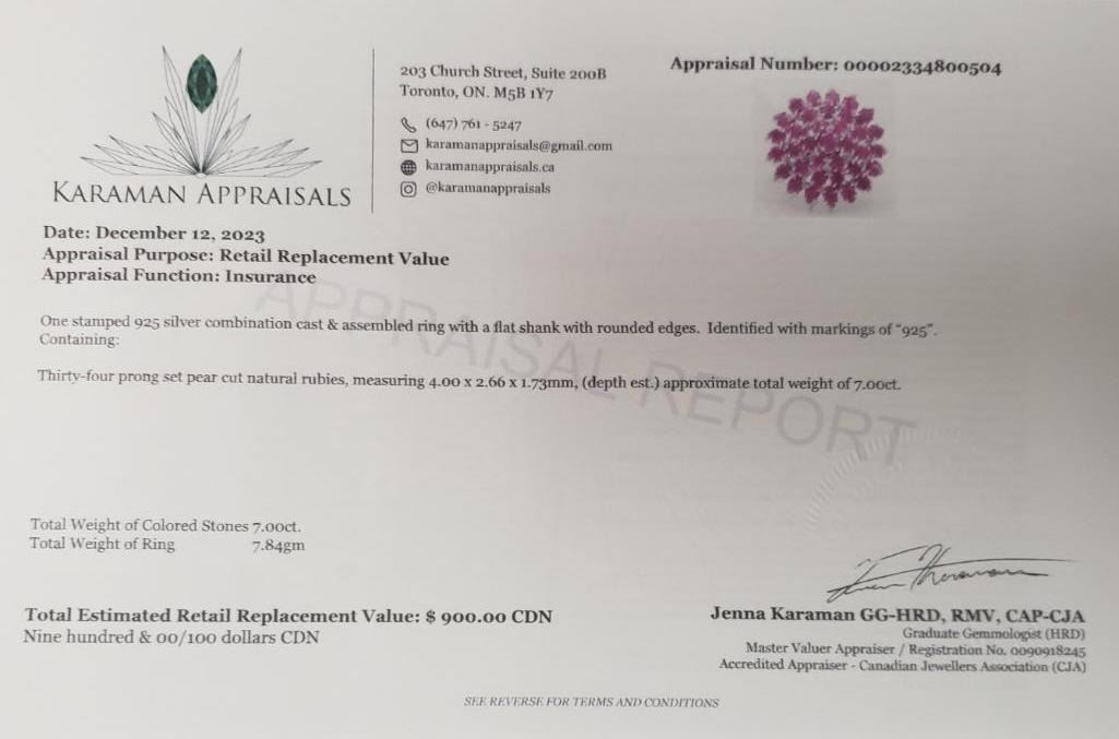 Silver Natural Ruby(7ct) Ring (~weight 7.84g), Appraised Retail $900