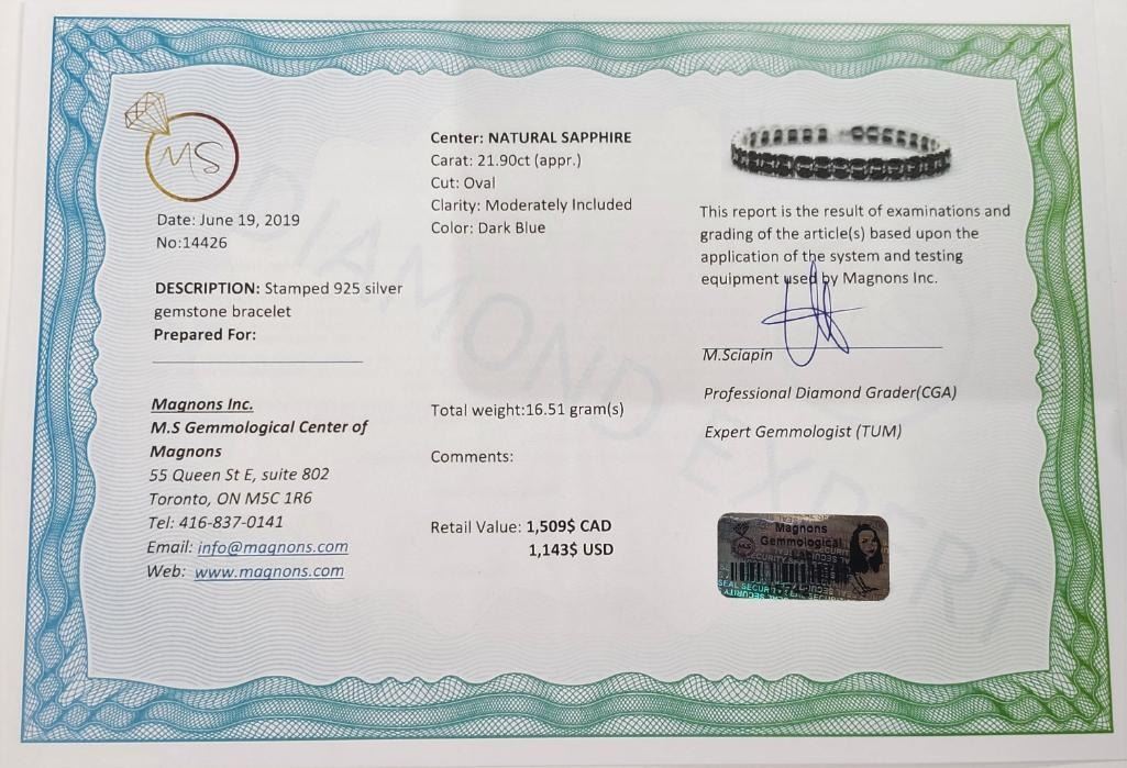 Silver Sapphire 7.5" Bracelet (~weight 16.51g), Suggested Retail Value $1509