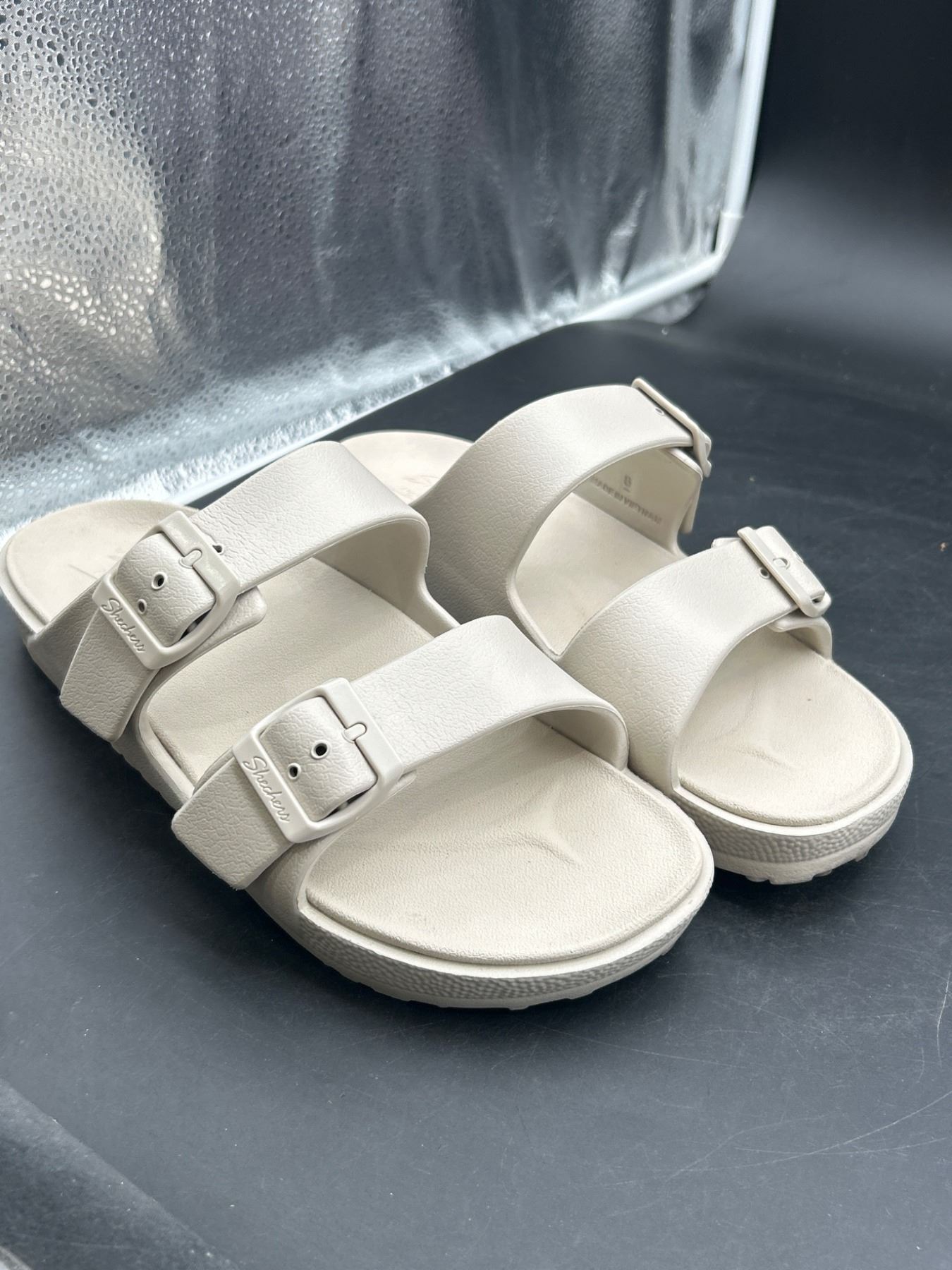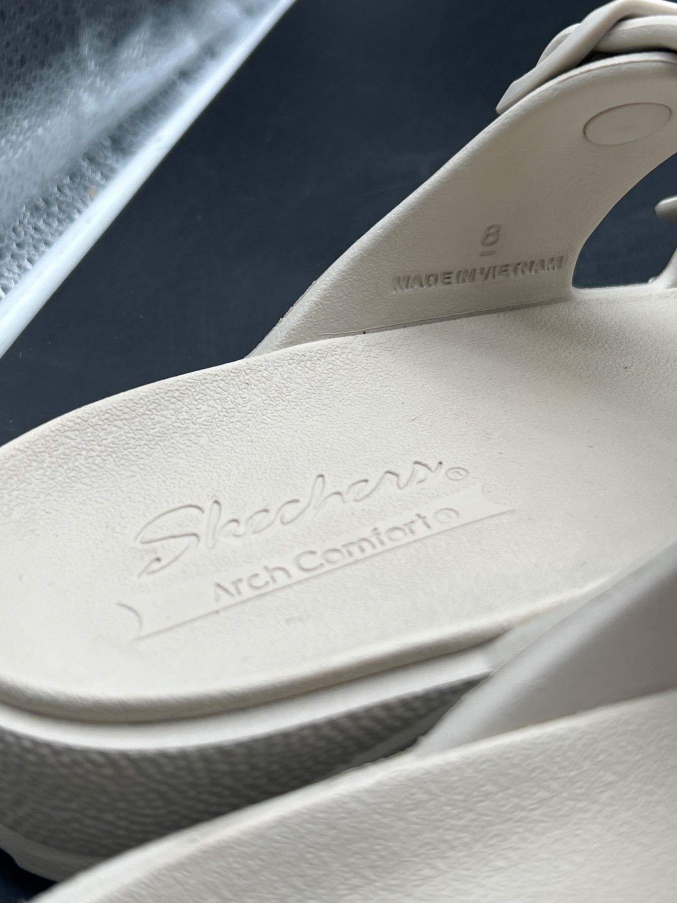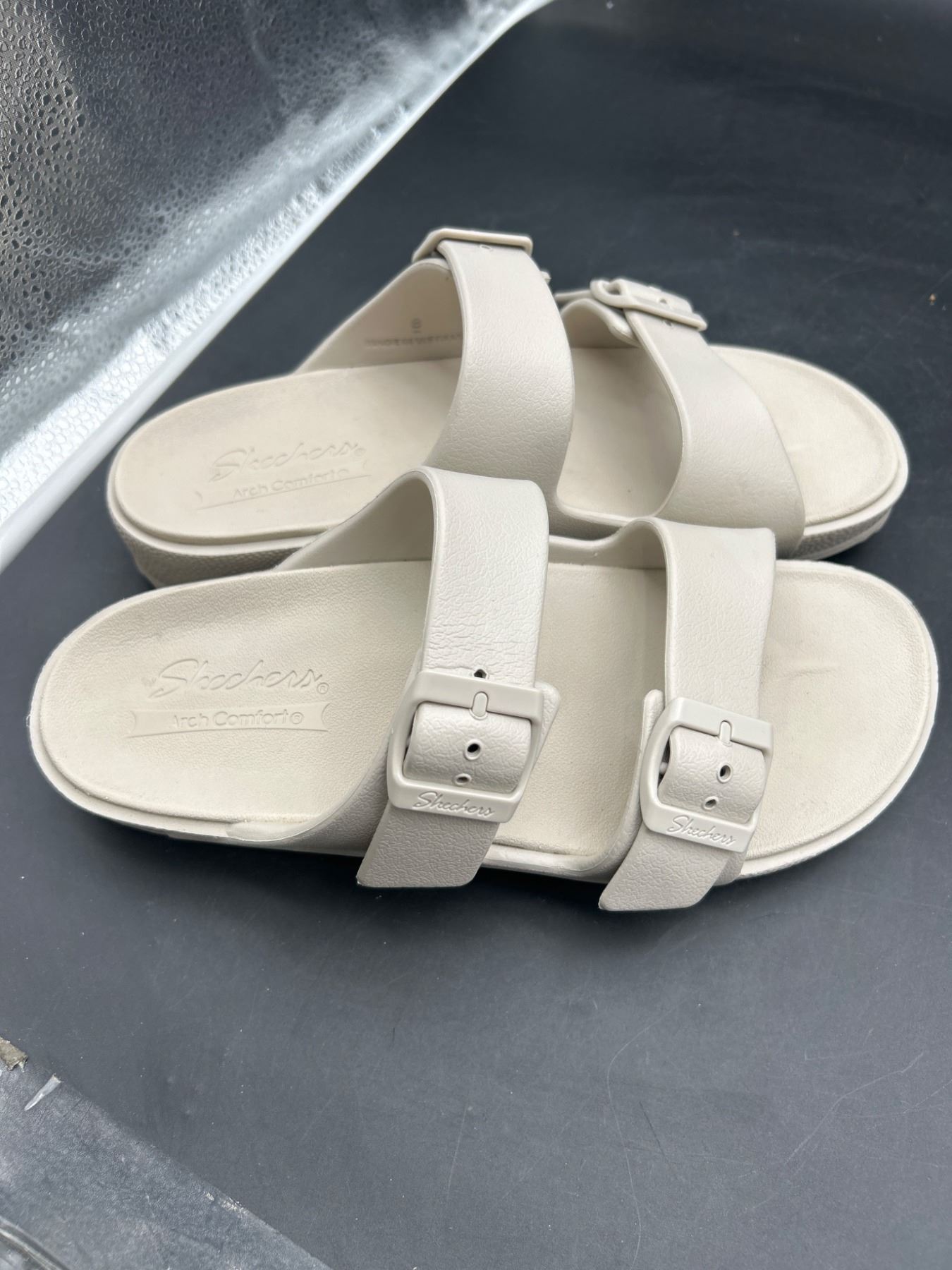 This listing features a pair of Skechers Arch Comfort sandals in beige, size 8. Designed with adjustable buckle straps and a textured sole for added grip. The sandals are labeled ‘Made in Vietnam’ and display the Skechers logo on the insoles, ensuring comfort and quality.