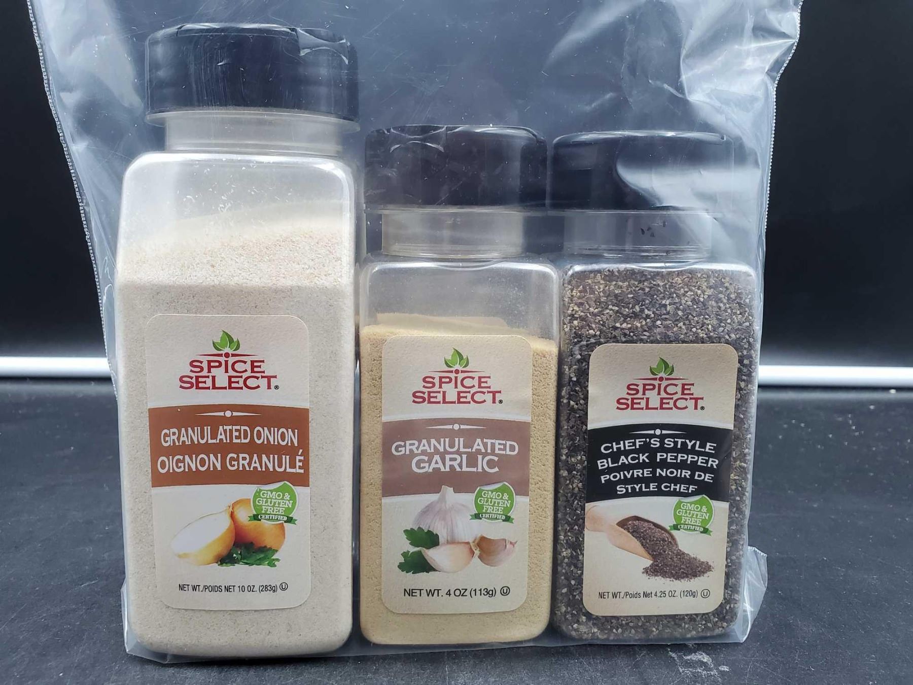 Spice Select Spices Lot of 3 - Granulated Onion 283g, Granulated Garlic 113g, Chef's Style Black Pepper 120g