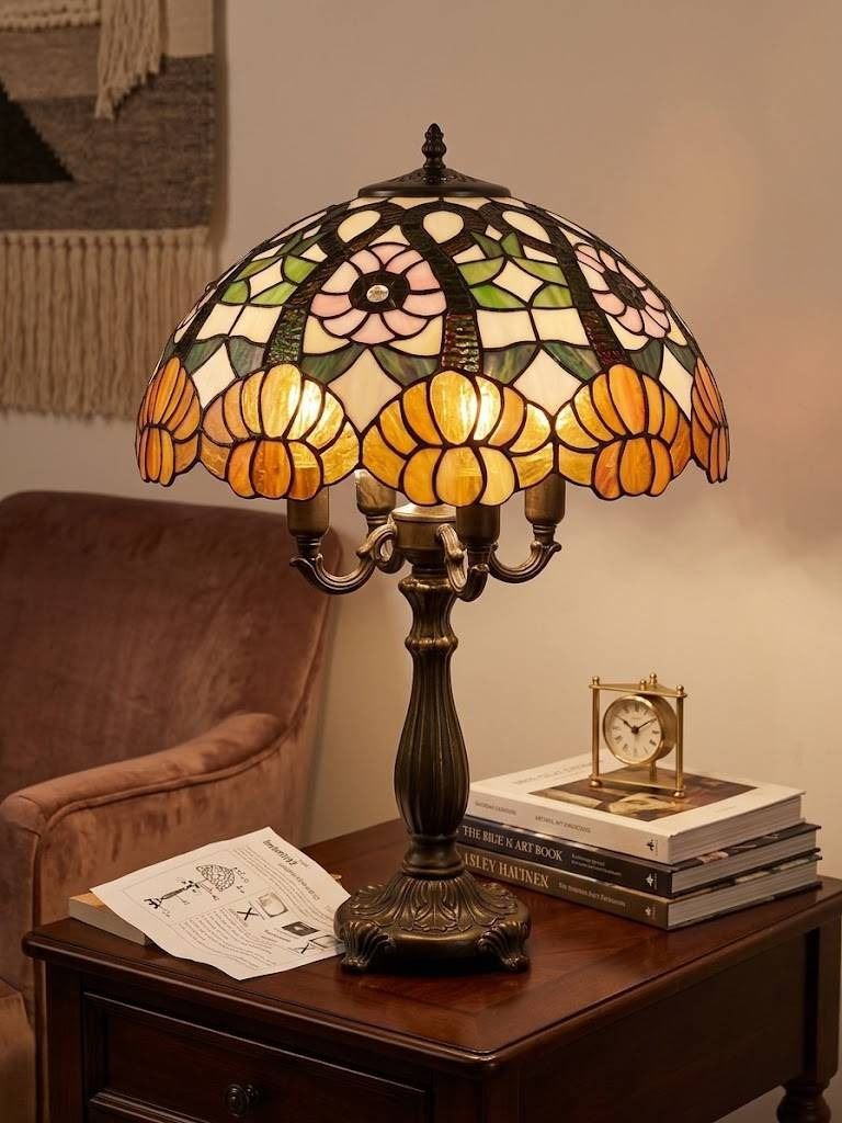 Stained Glass Lamp With Floral Design and Dual Bulb Capability
